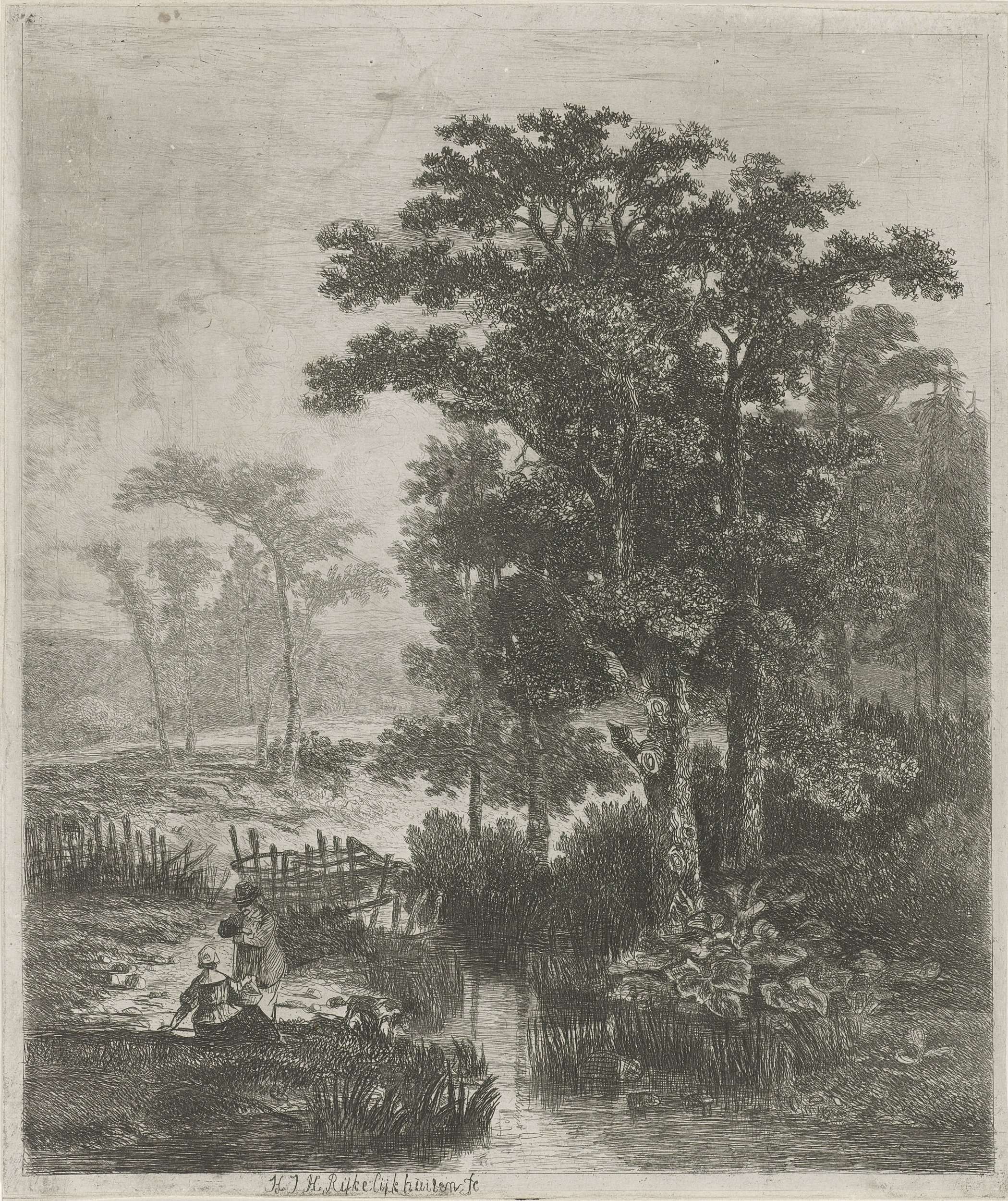 Een stroompje bij een bosrand. Aan de oever van het water staat een hond te drinken en bevinden zich een man en een vrouw met een mand.
