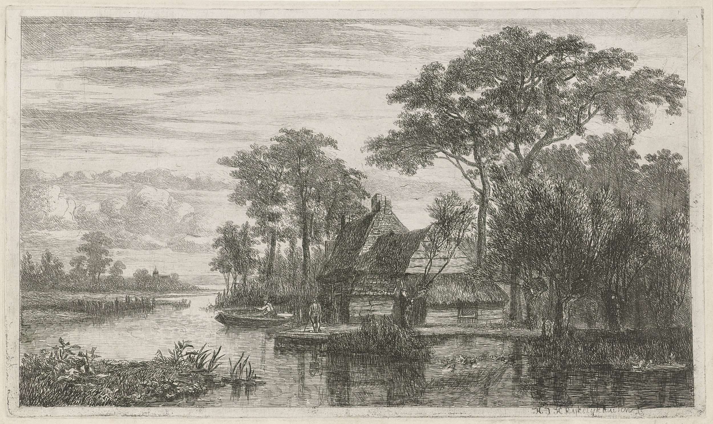 Een rivier met aan de waterkant enige huizen en twee hengelaars. Op de voorgrond een groep eenden en twee knotwilgen. Op de achtergrond de contouren van een kerk.