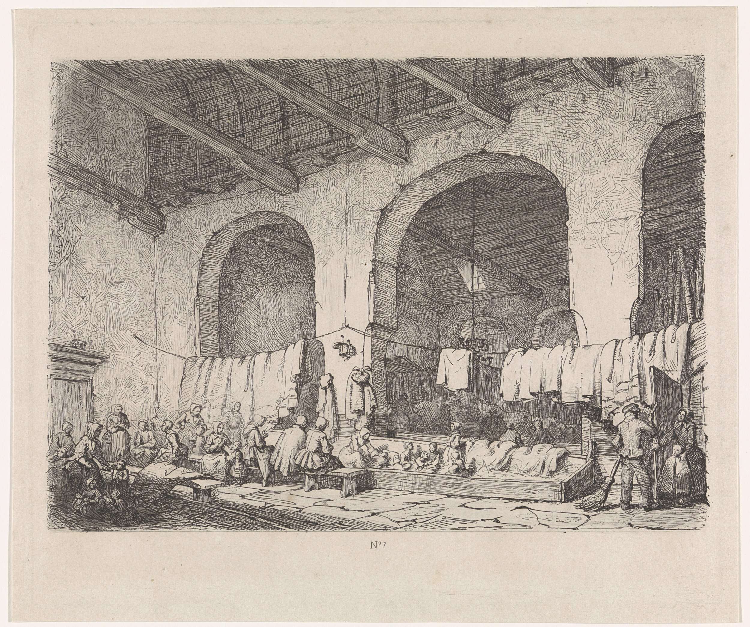 In de Geertekerk te Utrecht bevinden zich slachtoffers van de watersnoodramp van 1855. Op de lange banken zitten voornamelijk vrouwen en kinderen en aan twee waslijnen hangt textiel te drogen. Rechts staat een man met een bezem. Deze prent maakt deel uit van een serie.