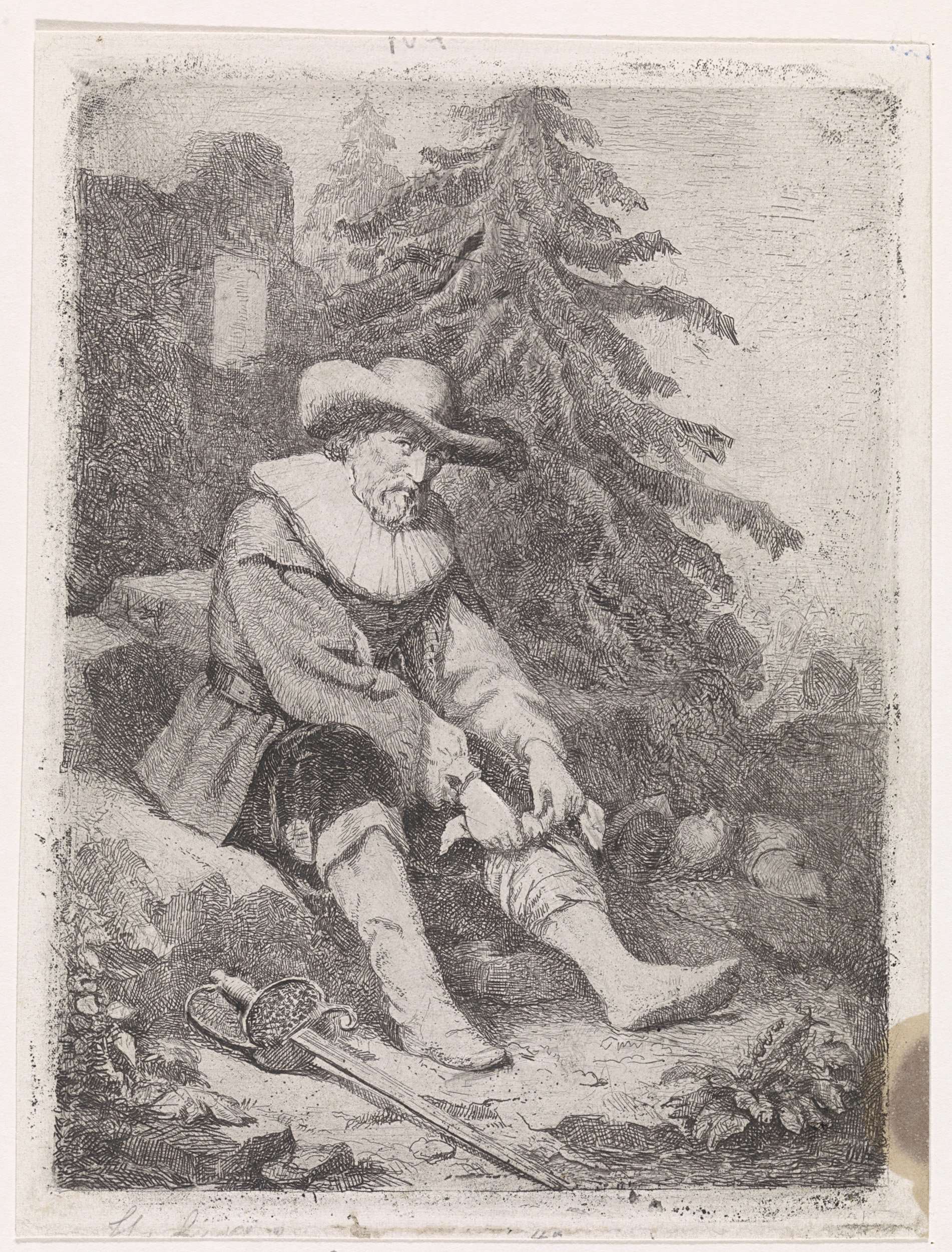 In een landschap verbindt een krijgsman zijn gewonde linkerbeen. Rechts naast hem ligt het levenloze lichaam van een soldaat, en links zijn rapier. Op de achtergrond zijn een aantal naaldbomen en de contouren van een verwoeste gevel te zien.
