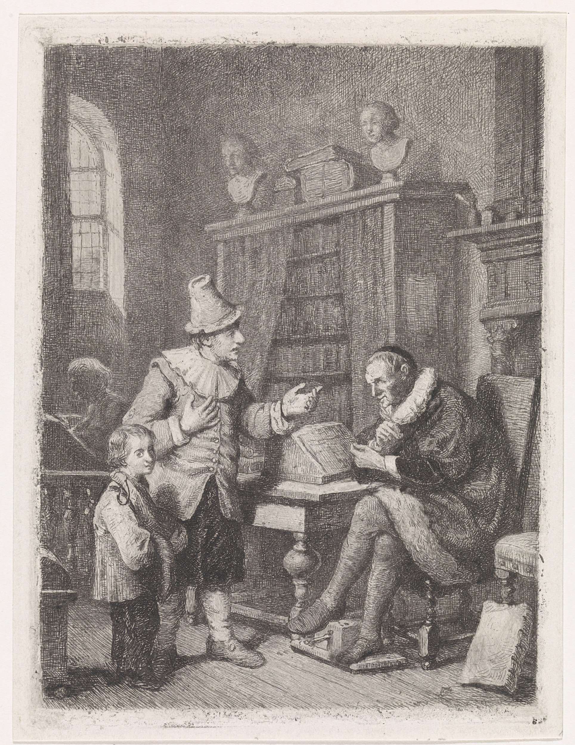 In een vertrek zit een rijkelijk geklede advocaat voor de schouw bij een lessenaar, waarvoor een gebarende man met hoed staat. Bij de man staat een jongetje dat in de richting van de toeschouwer kijkt en een ham en worst bij zich heeft. De man vraagt mogelijk raad aan de advocaat, die de man met ...