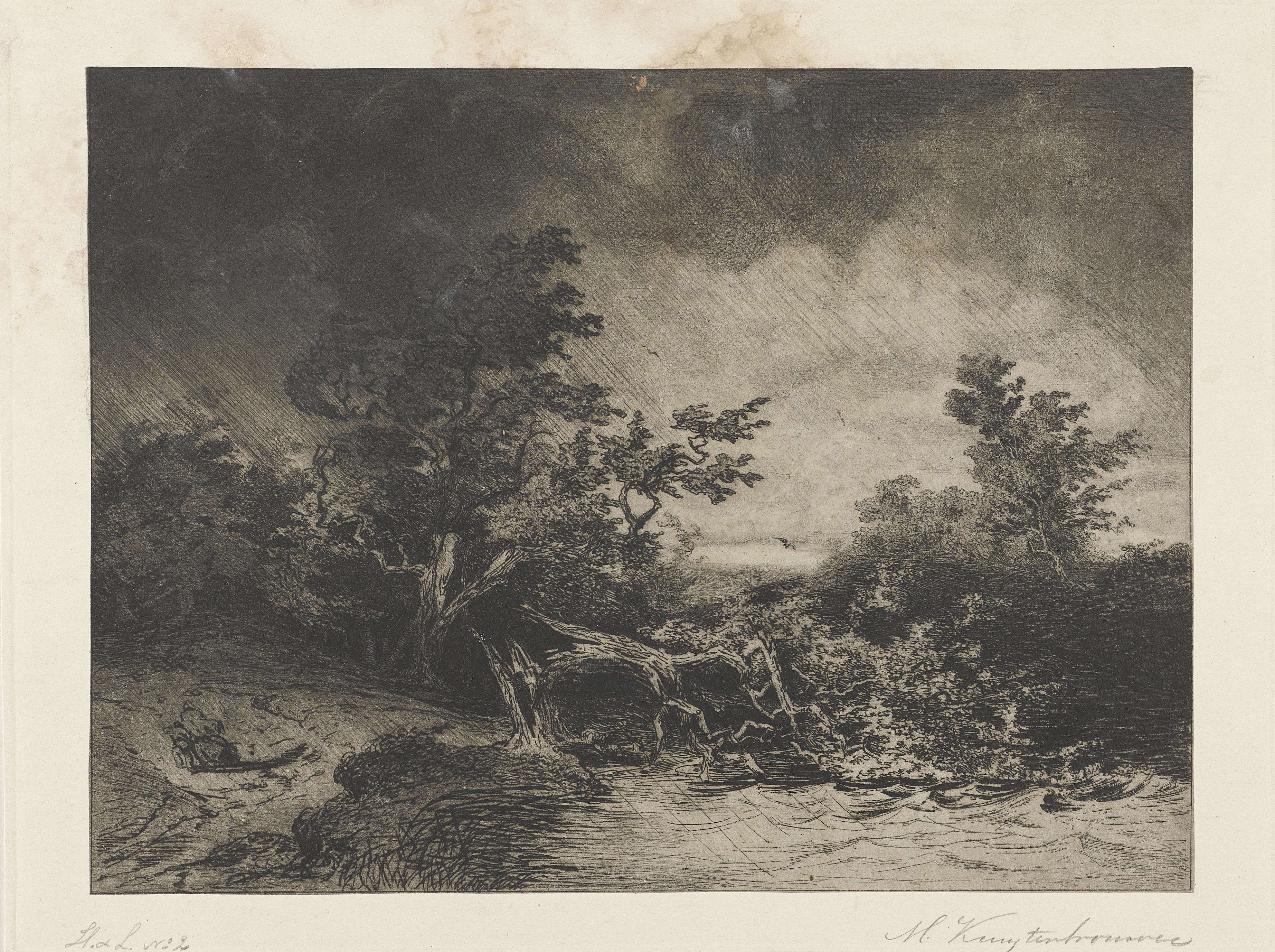 Een storm jaagt door een stuk bos met een poel. In het midden is een boom omgewaaid en rechts slaan de golven van het meer tegen het land. Links lopen twee figuren over een bospad, hun kleding wappert in de wind.