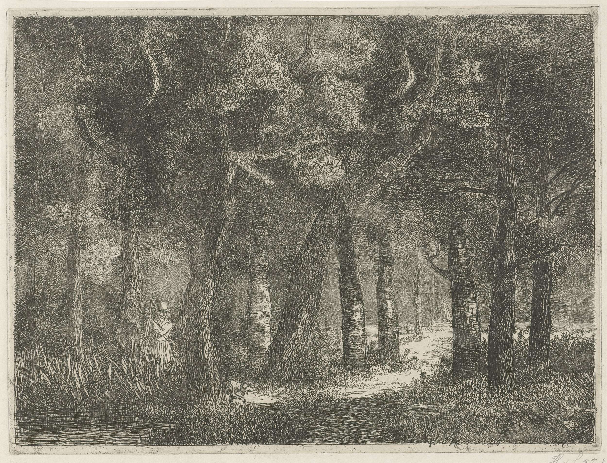 Jager en zijn hond in het bos