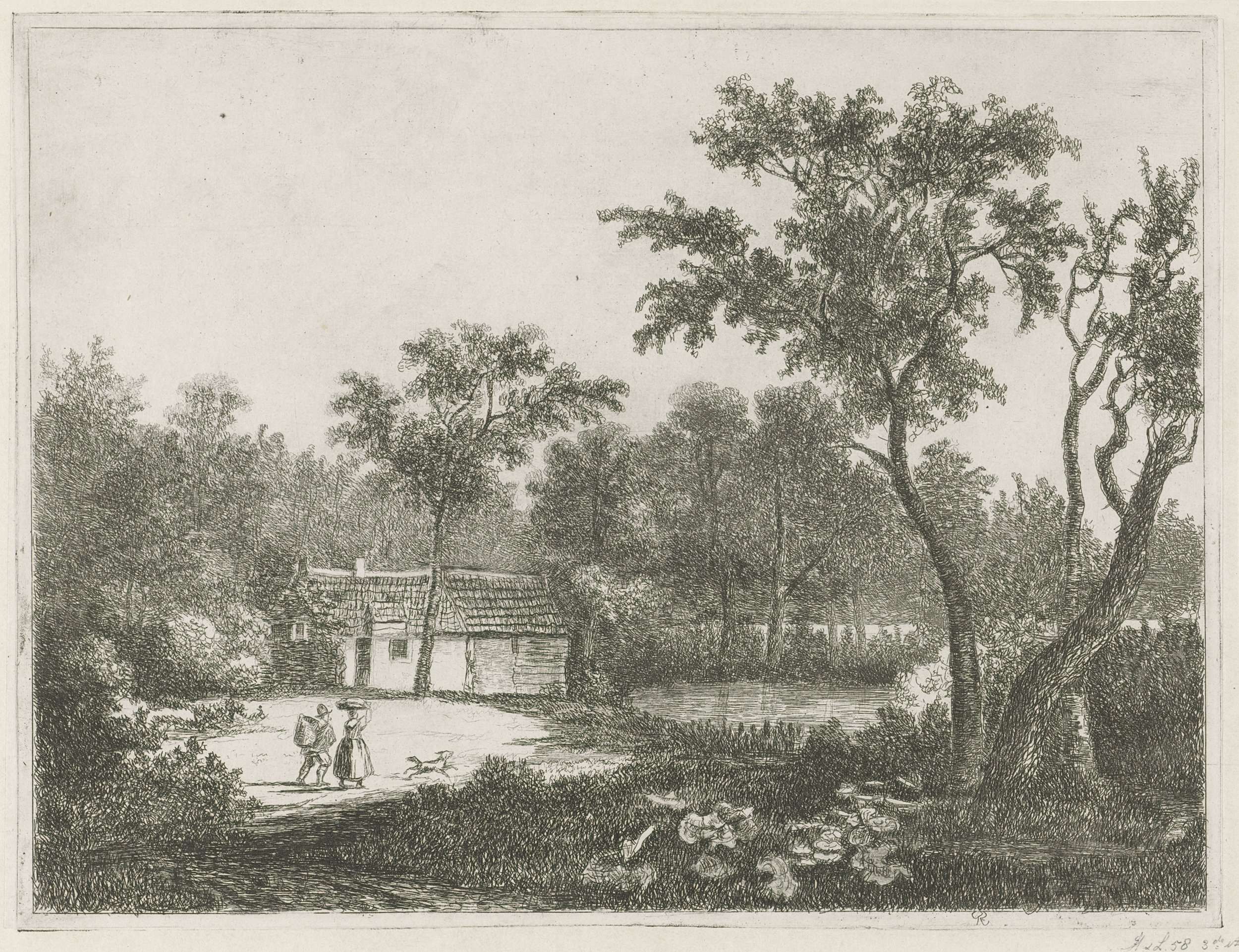 Gezicht op een open plek in het bos met een meer waar een huis naast ligt. Op de voorgrond een man en een vrouw met een hond.