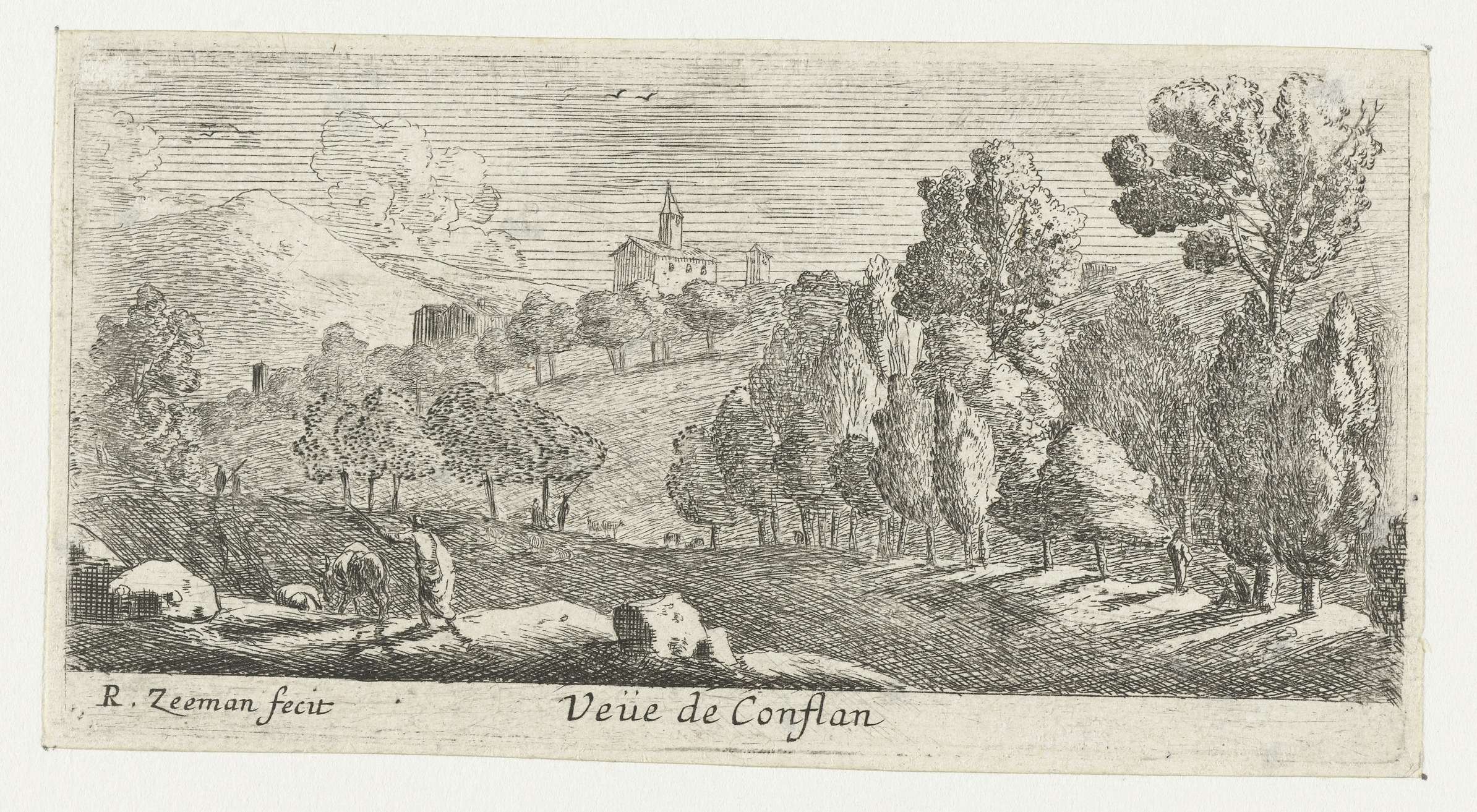 Gezicht op Conflans, een heuvelig landschap met een kerkje.