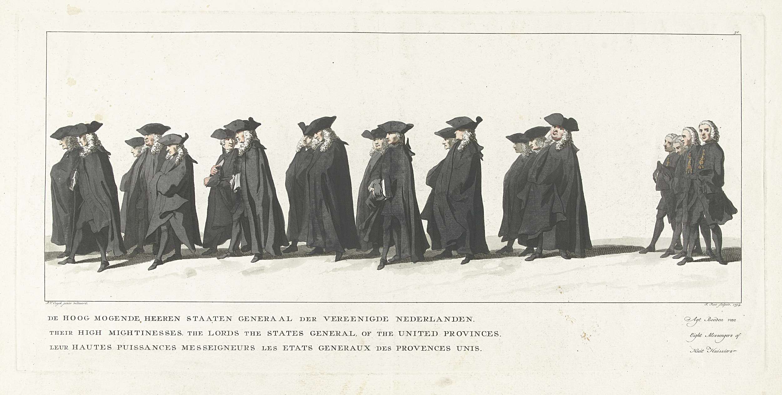 Leden van de Staten-Generaal. In de marge het onderschrift in Nederlands, Frans en Engels. Onderdeel van een serie van 41 platen van de begrafenisstoet van stadhouder Willem IV te Delft op 4 februari 1752. Genummerd rechtsboven: 30.