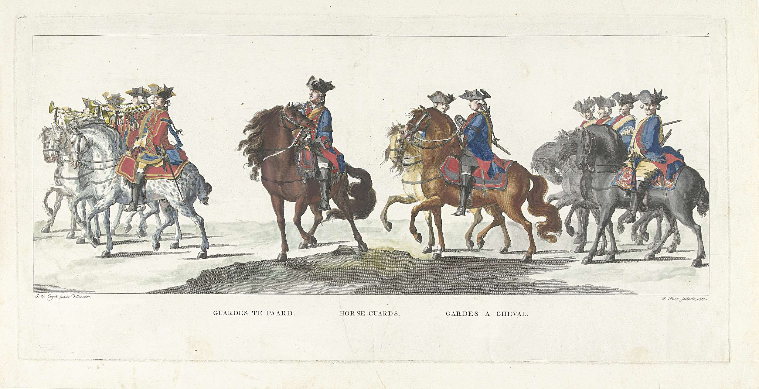 Gardes te paard, voorafgegaan door trompetters. In de marge het onderschrift in Nederlands, Frans en Engels. Onderdeel van een serie van 41 platen van de begrafenisstoet van stadhouder Willem IV te Delft op 4 februari 1752. Genummerd rechtsboven: 2.