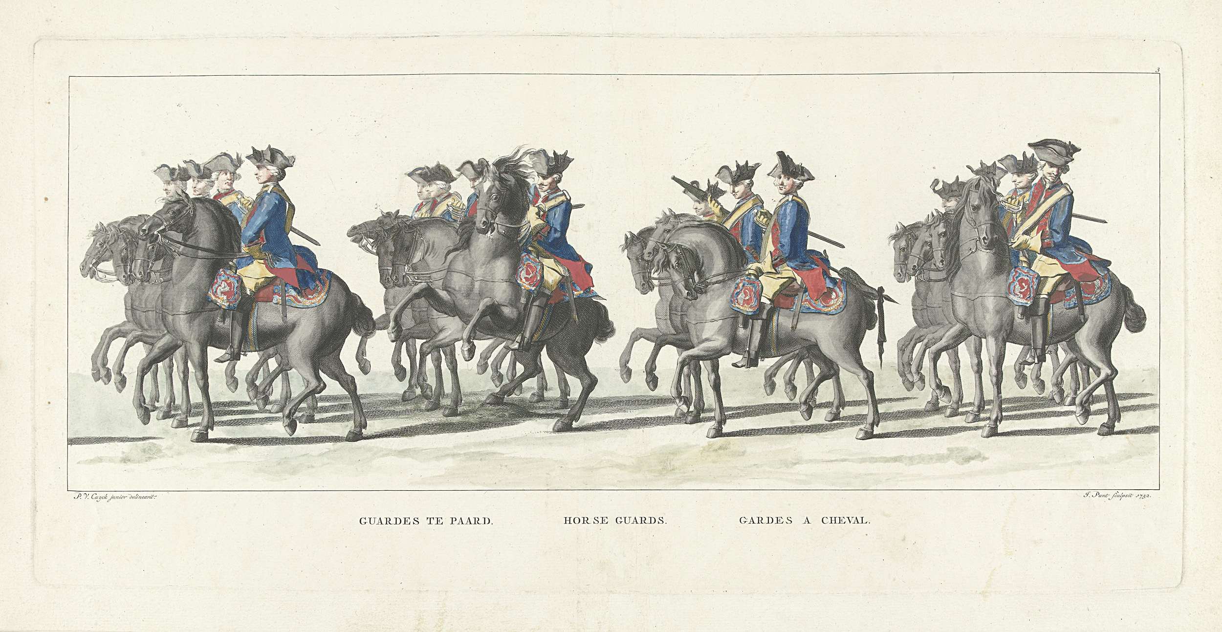 Vier groepen gardes te paard. In de marge het onderschrift in Nederlands, Frans en Engels. Onderdeel van een serie van 41 platen van de begrafenisstoet van stadhouder Willem IV te Delft op 4 februari 1752. Genummerd rechtsboven: 3.
