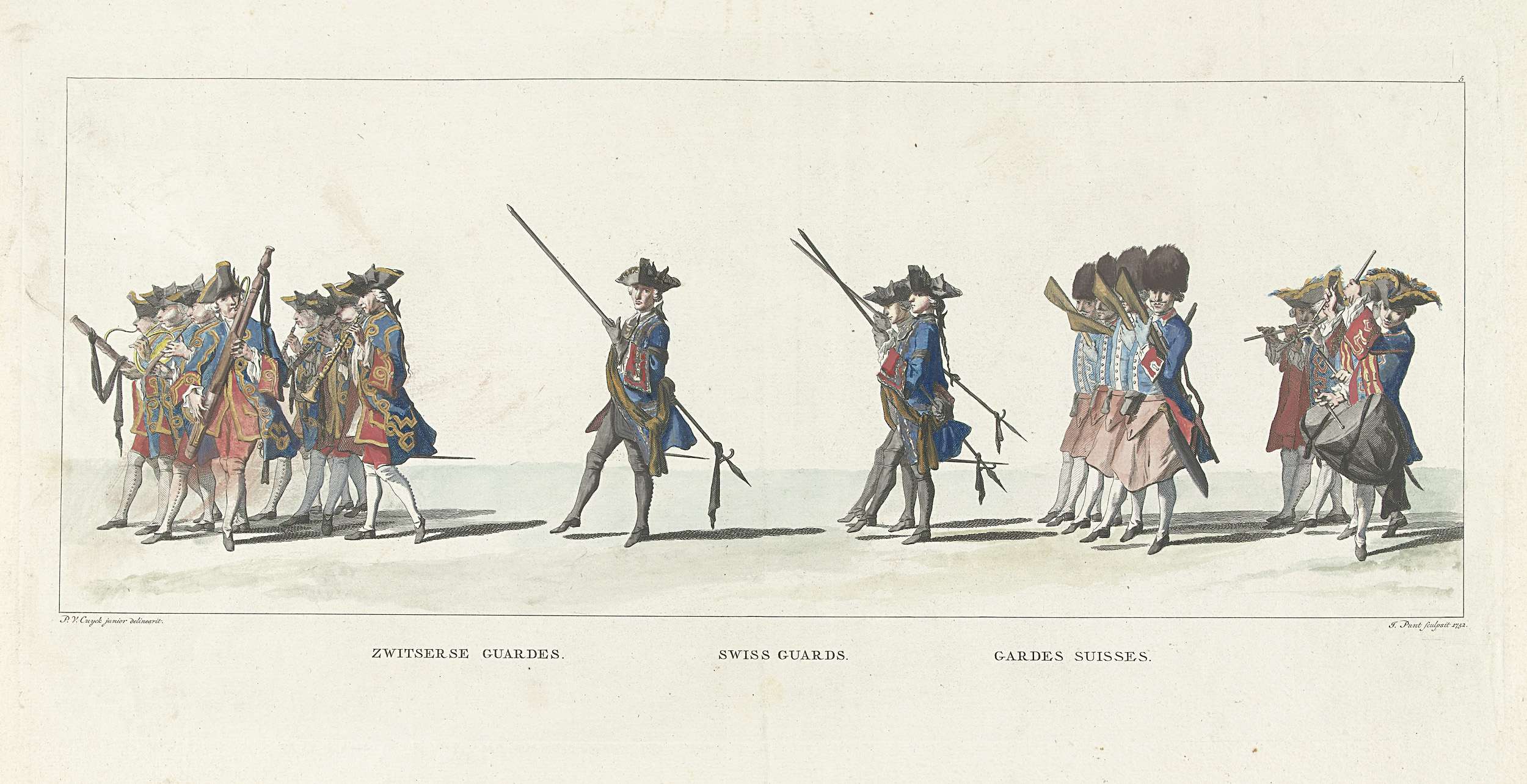 De Zwitserse Garde, met muzikanten. In de marge het onderschrift in Nederlands, Frans en Engels. Onderdeel van een serie van 41 platen van de begrafenisstoet van stadhouder Willem IV te Delft op 4 februari 1752. Genummerd rechtsboven: 5.