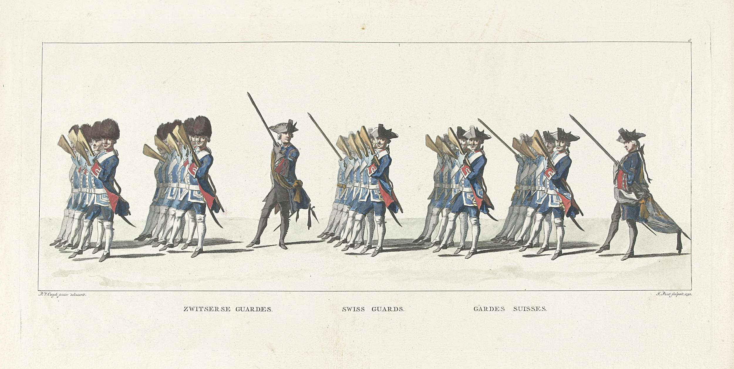 De Zwitserse Garde. In de marge het onderschrift in Nederlands, Frans en Duits. Onderdeel van een serie van 41 platen van de begrafenisstoet van stadhouder Willem IV te Delft op 4 februari 1752. Genummerd rechtsboven: 6.