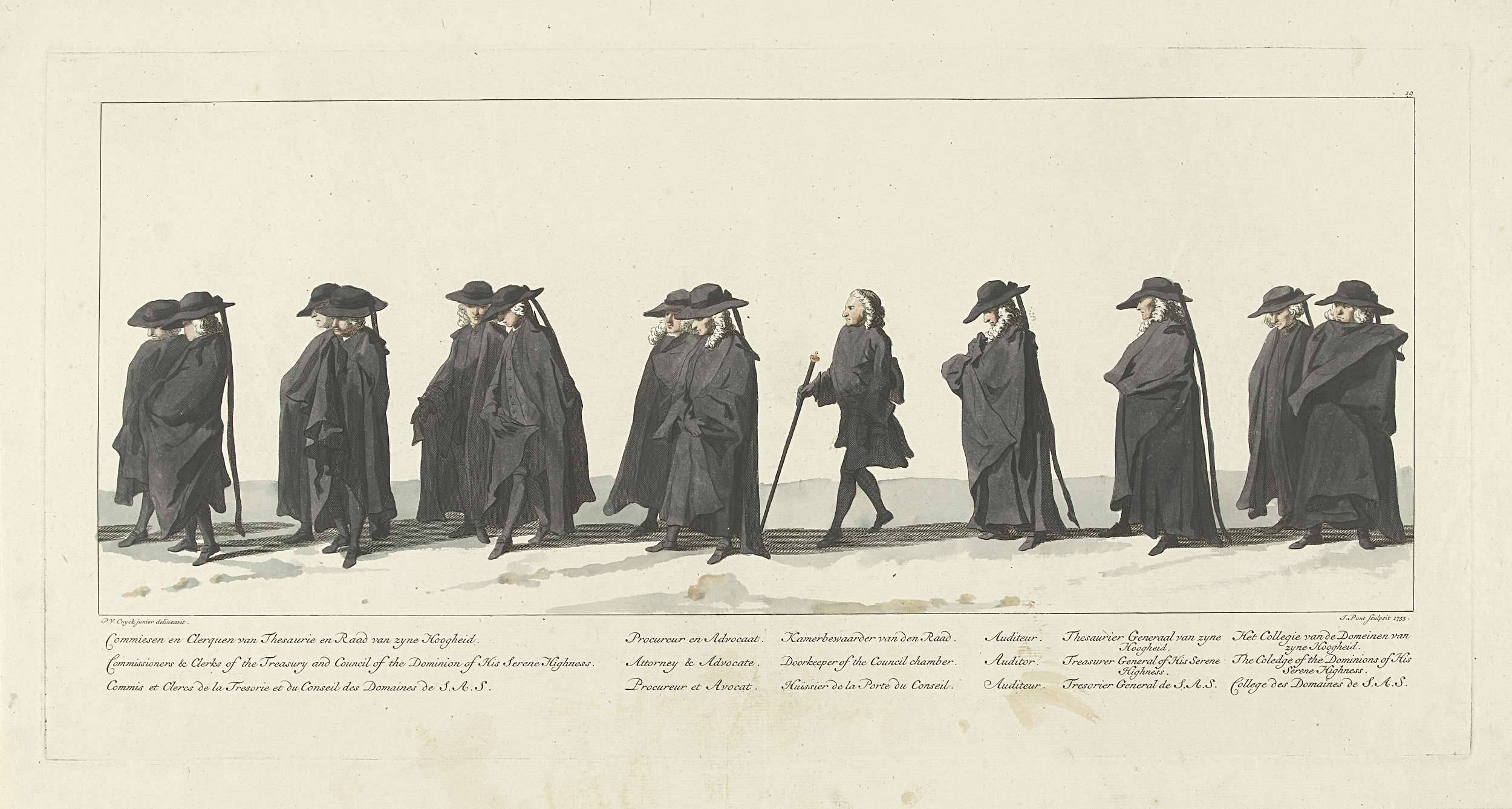 Leden van het stadhouderlijk bestuurlijk apparaat. In de marge het onderschrift in Nederlands, Frans en Engels. Onderdeel van een serie van 41 platen van de begrafenisstoet van stadhouder Willem IV te Delft op 4 februari 1752. Genummerd rechtsboven: 19.