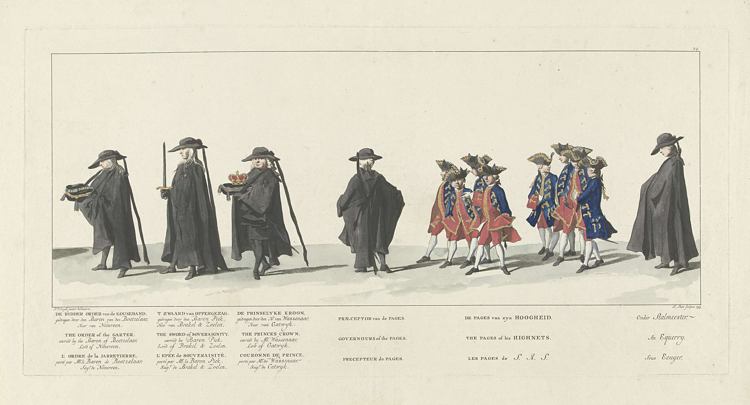 Dragers met stadhouderlijke insignia gevolg door een groep pages. In de marge het onderschrift in Nederlands, Frans en Engels. Onderdeel van een serie van 41 platen van de begrafenisstoet van stadhouder Willem IV te Delft op 4 februari 1752. Genummerd rechtsboven: 24.