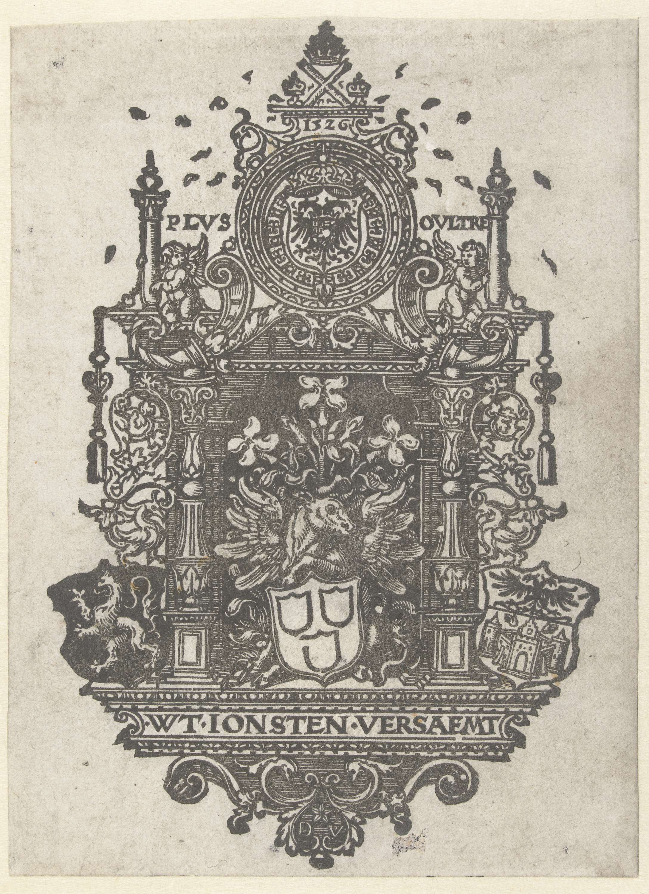Blazoen met wapens van de stad Antwerpen en gevleugelde os in het midden.