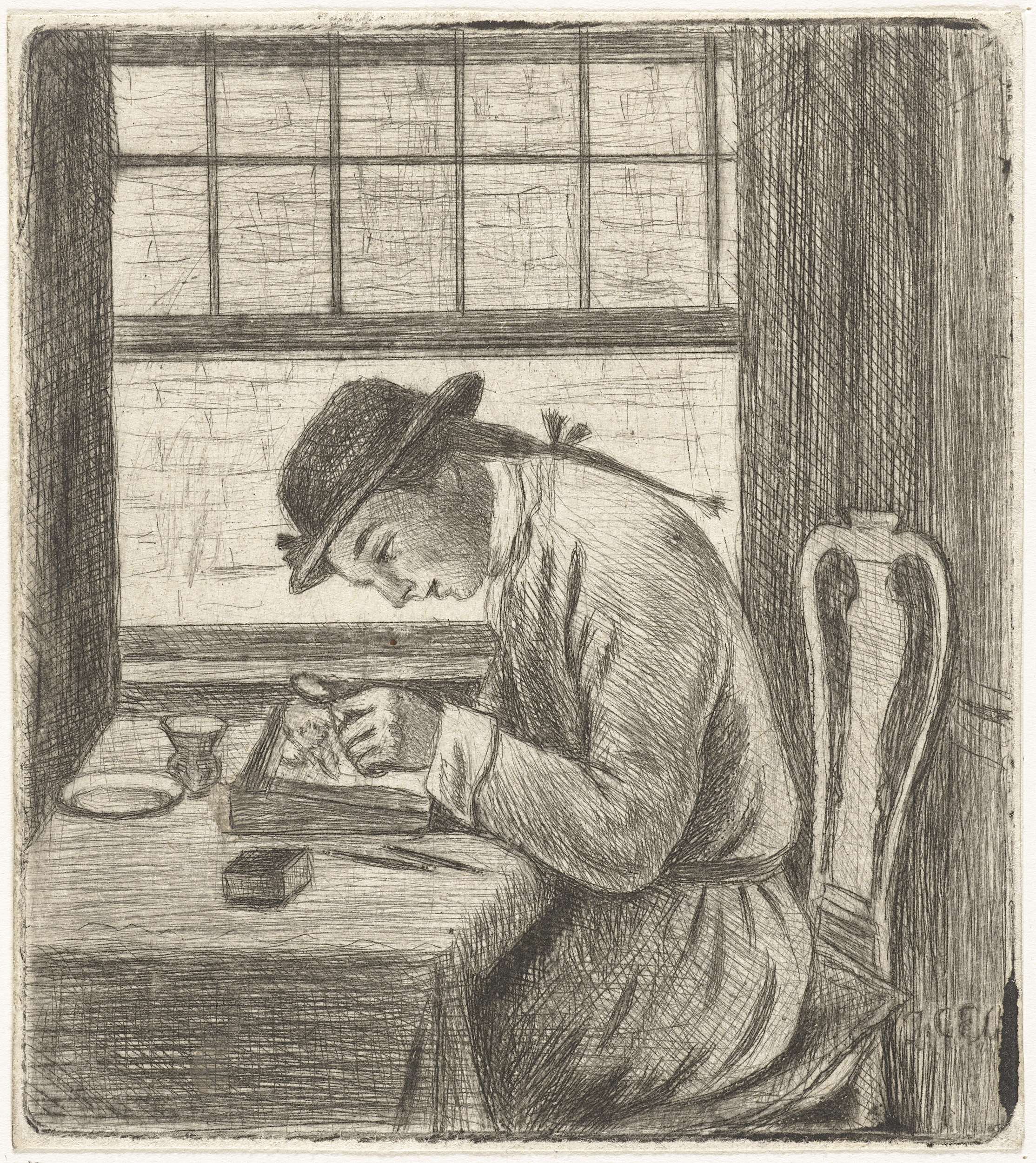 Zelfportret van Jan Chalon. Hij zit aan een tafel aan een prent te werken. Op de tafel liggen allerlei instrumenten die moeten helpen met het werk.