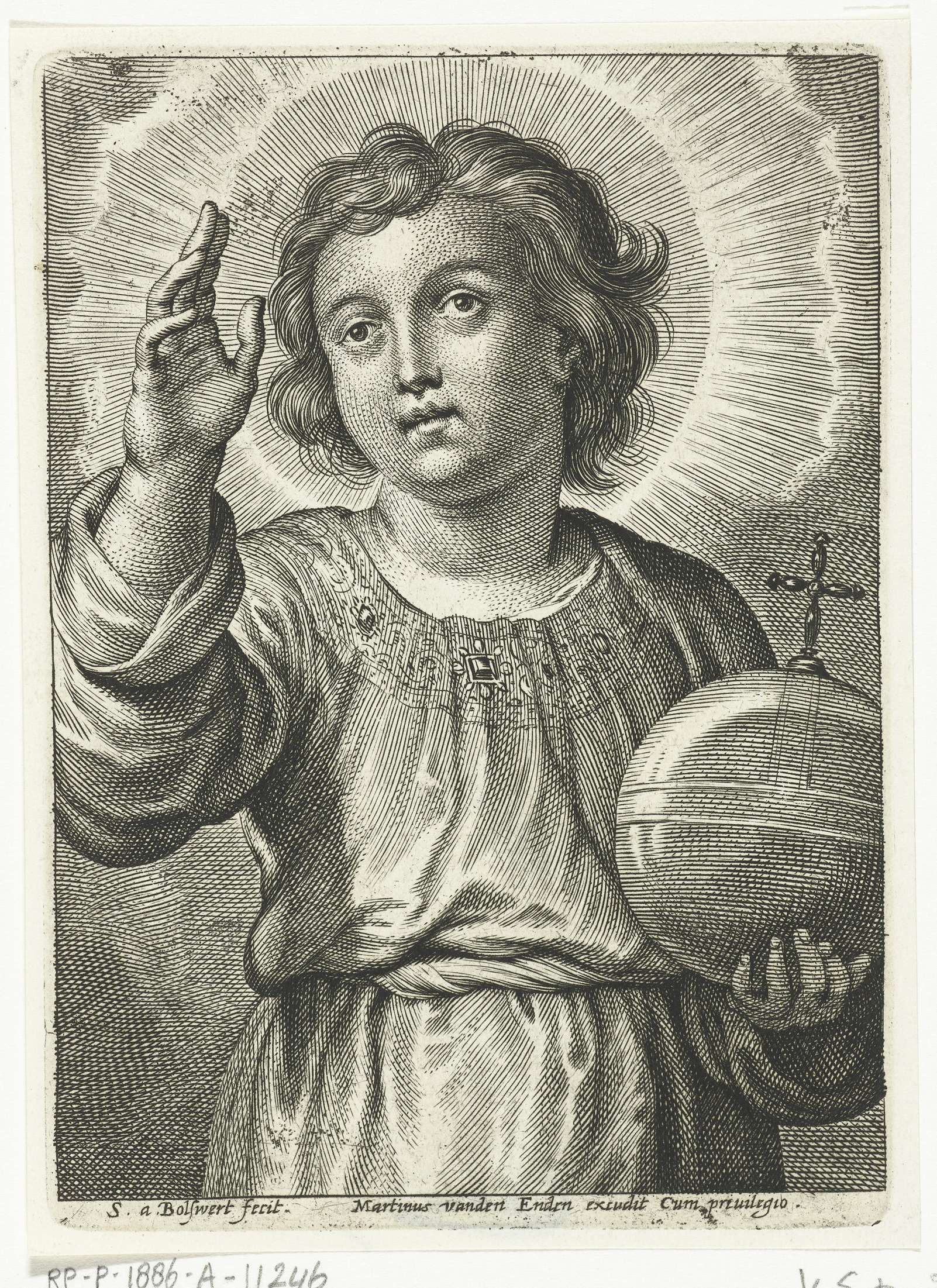 Christuskind met rijksappel in de hand maakt zegenend gebaar.