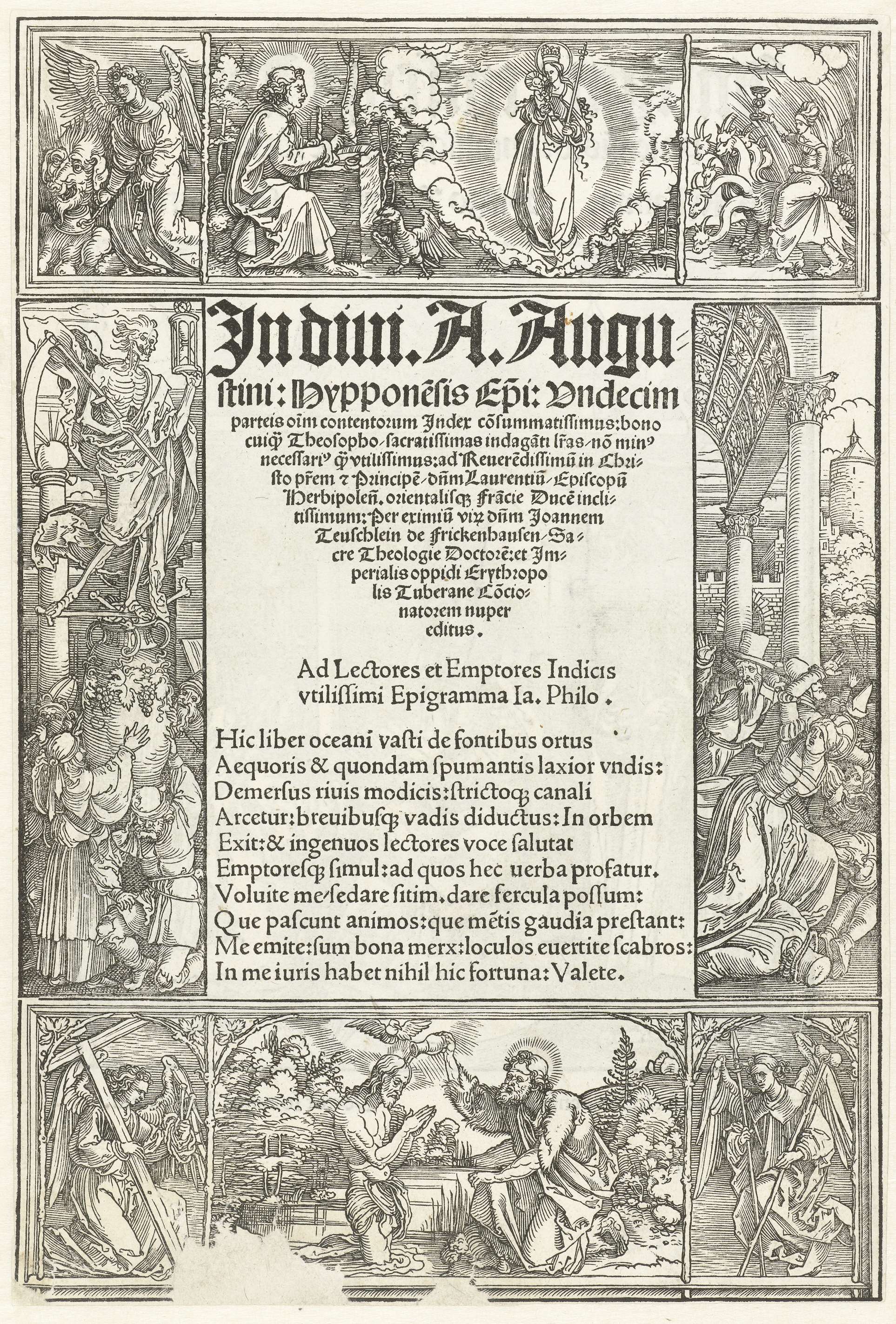 Titelblad met een Latijnse tekst en daaromheen een lijst van voorstellingen, gedrukt van vier blokken. Boven: Johannes de Evangelist ziet Maria met het Christuskind in een visioen, terwijl hij aan een lezenaar schrijft; links daarvan een engel met een geketende duivel; rechts ervan de hoer van Babylon. Onder: Johannes doopt Christus; links en rechts daarvan ...