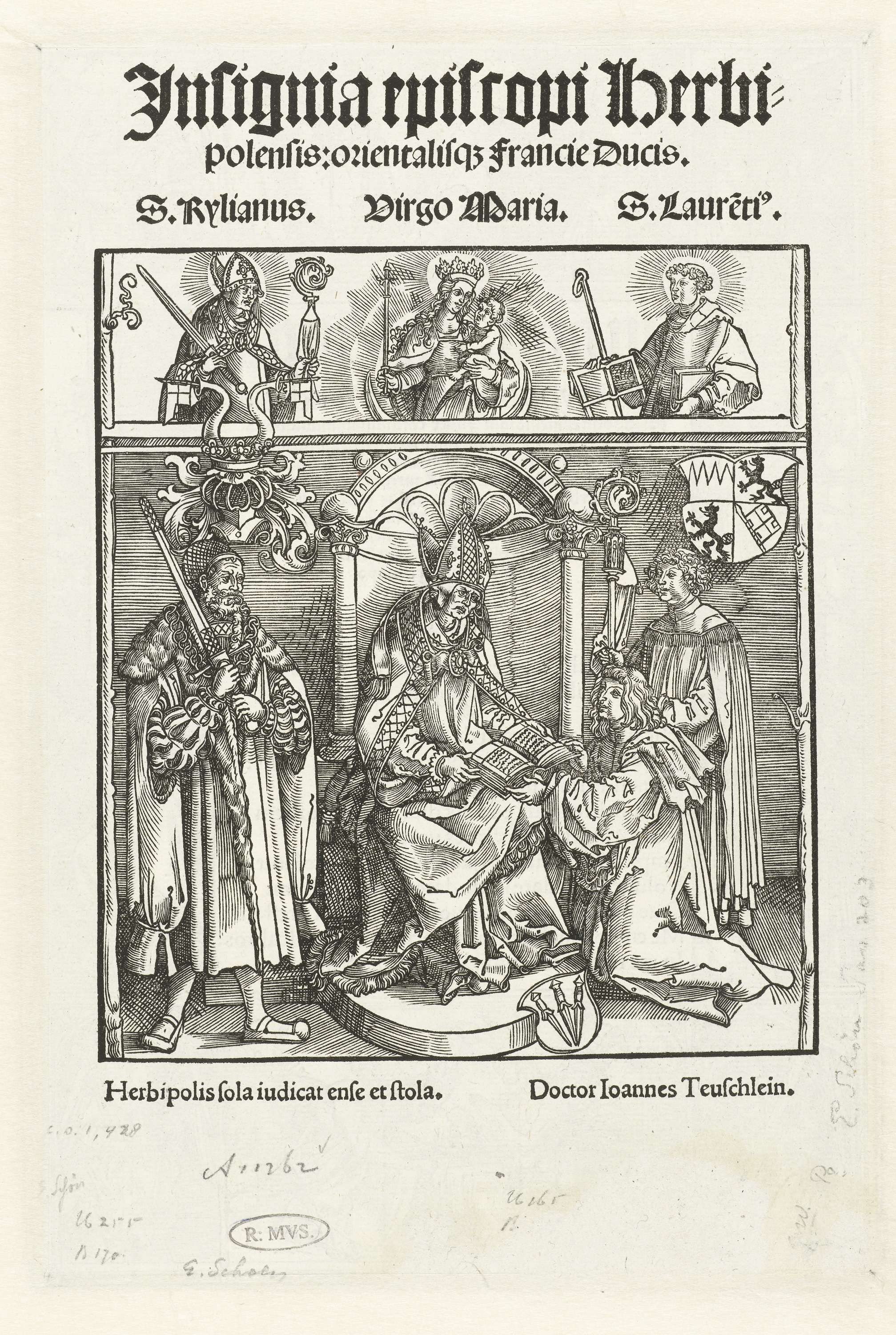 Titelblad (?) met een voorstelling van Johannes Teuschlein die zijn boek aanbiedt aan de bisschop van Würzburg, gezeten op een troon en geflankeerd door twee mannen. Daarboven de Heilige Kiliaan, Maria met het Christuskind en de Heilige Laurentius. Boven en onder de voorstelling Latijnse teksten. Versozijde van een ander titelblad.