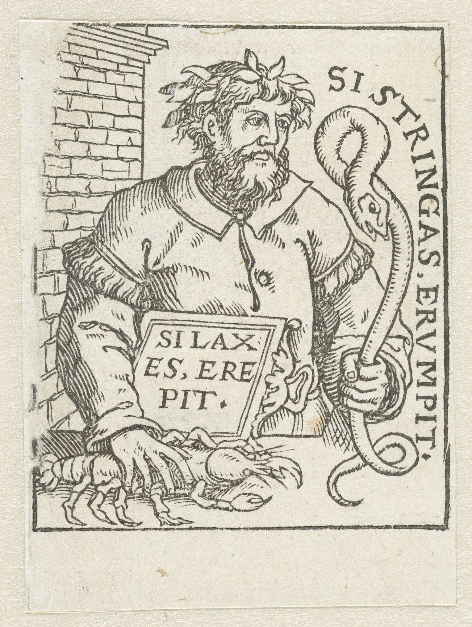 Man met lauwerkrans op hoofd, een slang in de linkerhand en in de rechter een kreeft. naast de slang staat het opschrift: si stringas crvmpit. Naar de kreeft staat een tableau met het opschrift: si lax es, ere pit. Mogelijk het drukkervignet van Diestenus.