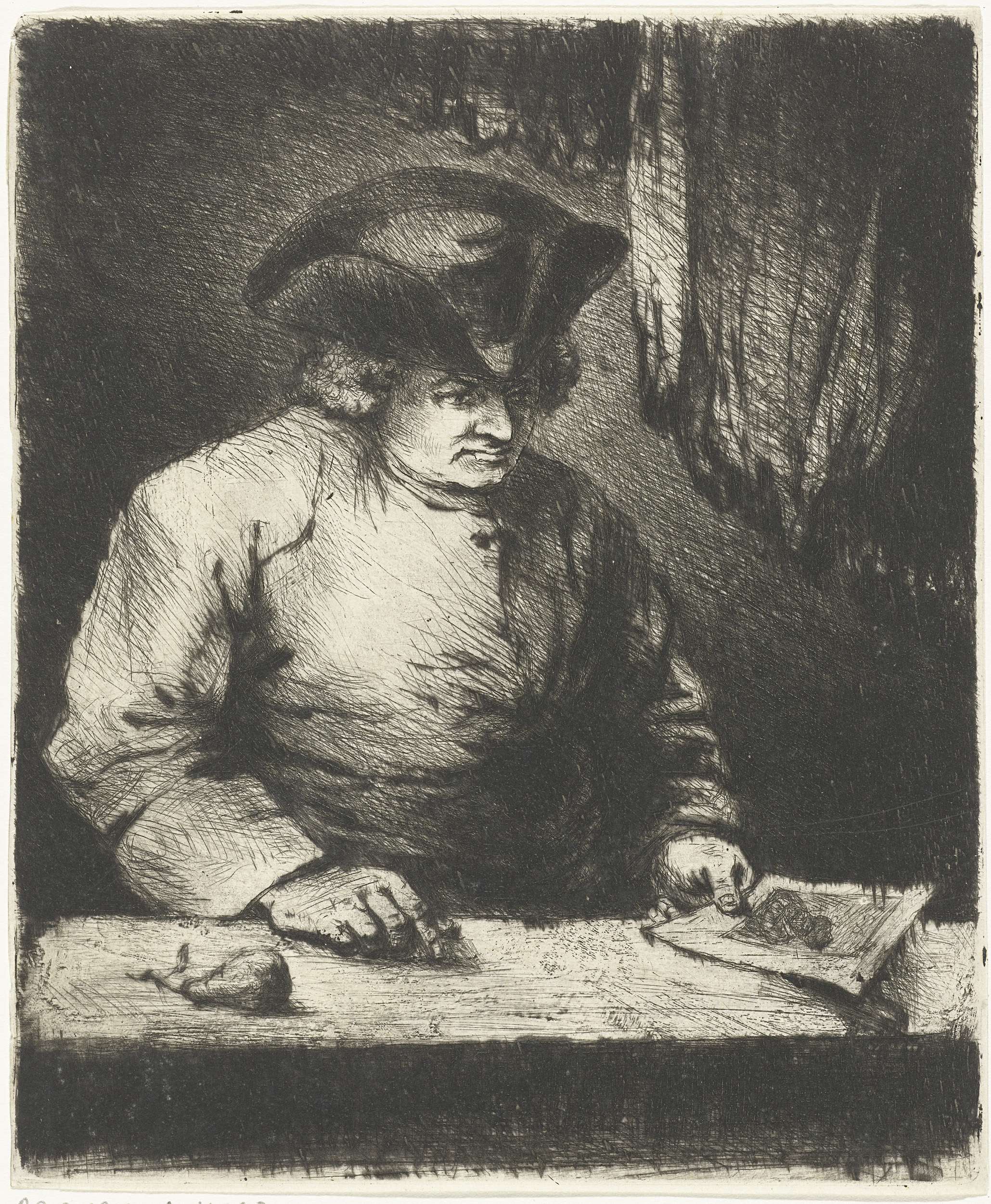 Portret van Hendrik Chalon, tekenaar en vader van de prentmaker. Hendrik staat met buste naar rechts voor een tafel en bestudeert een prent die hij in zijn linkerhand houdt. op zijn hoofd draagt hij een steek. Links op het tafeltje ligt een peer.