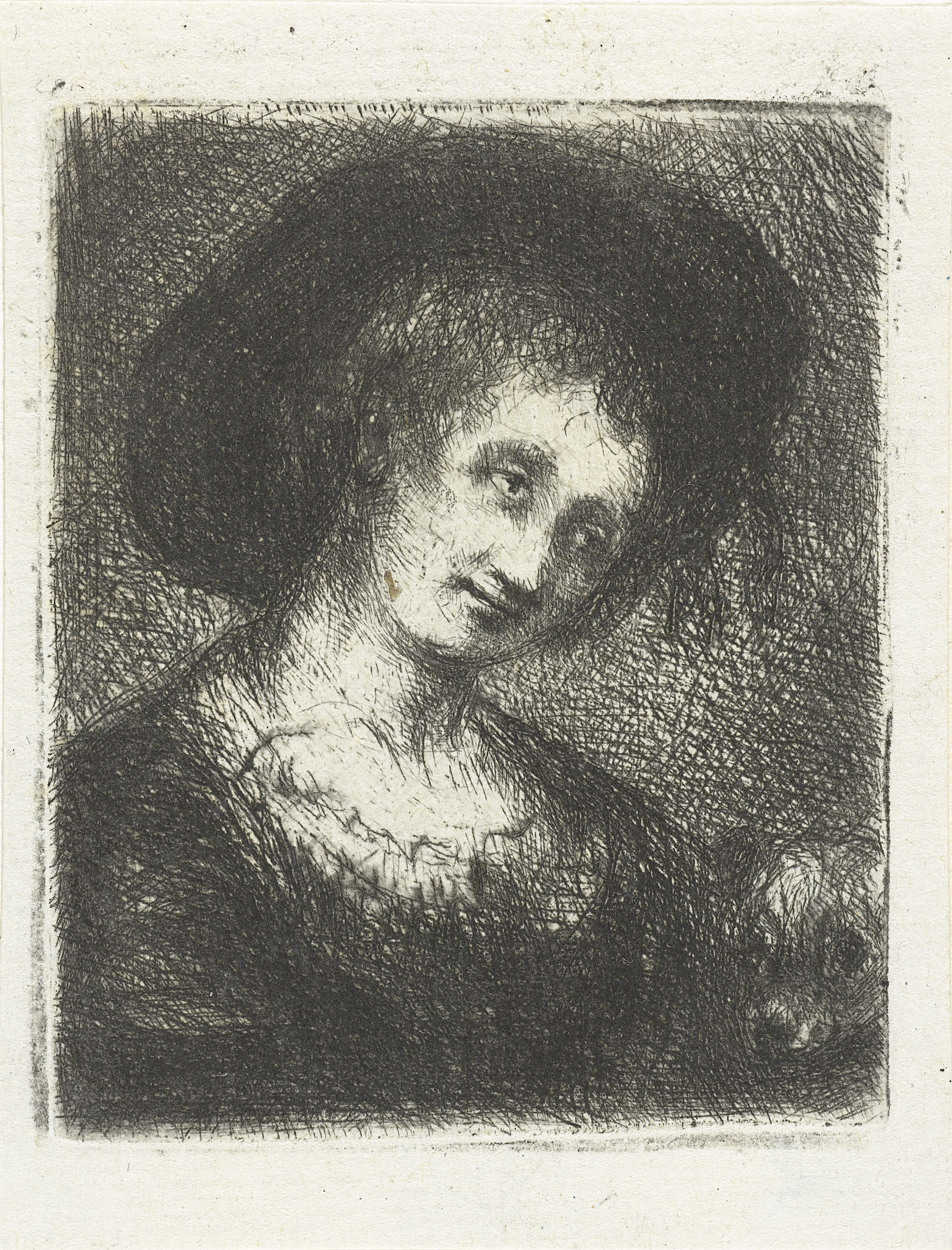 Een volwassen vrouw met een hoed. Buste naar rechts. Rechts van haar een hond.