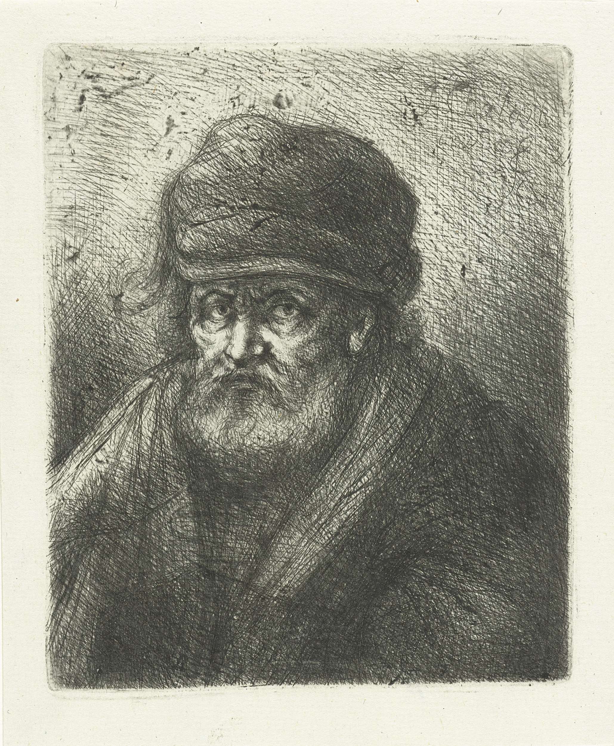 Portret van een oude man met baard en muts. Buste naar links.