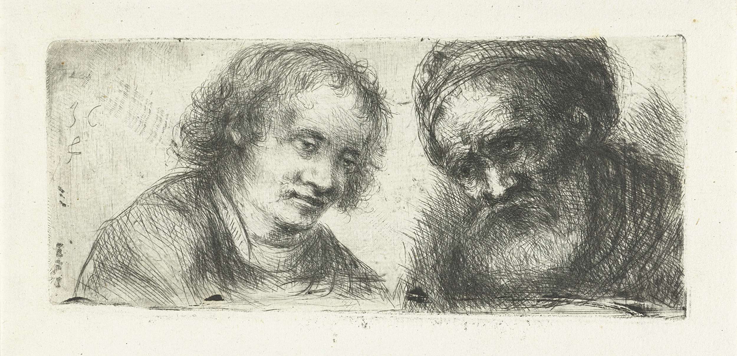Portret van twee mannen. Rechts een oude man met baard. Buste naar links. Links een jongeman. Buste naar rechts.