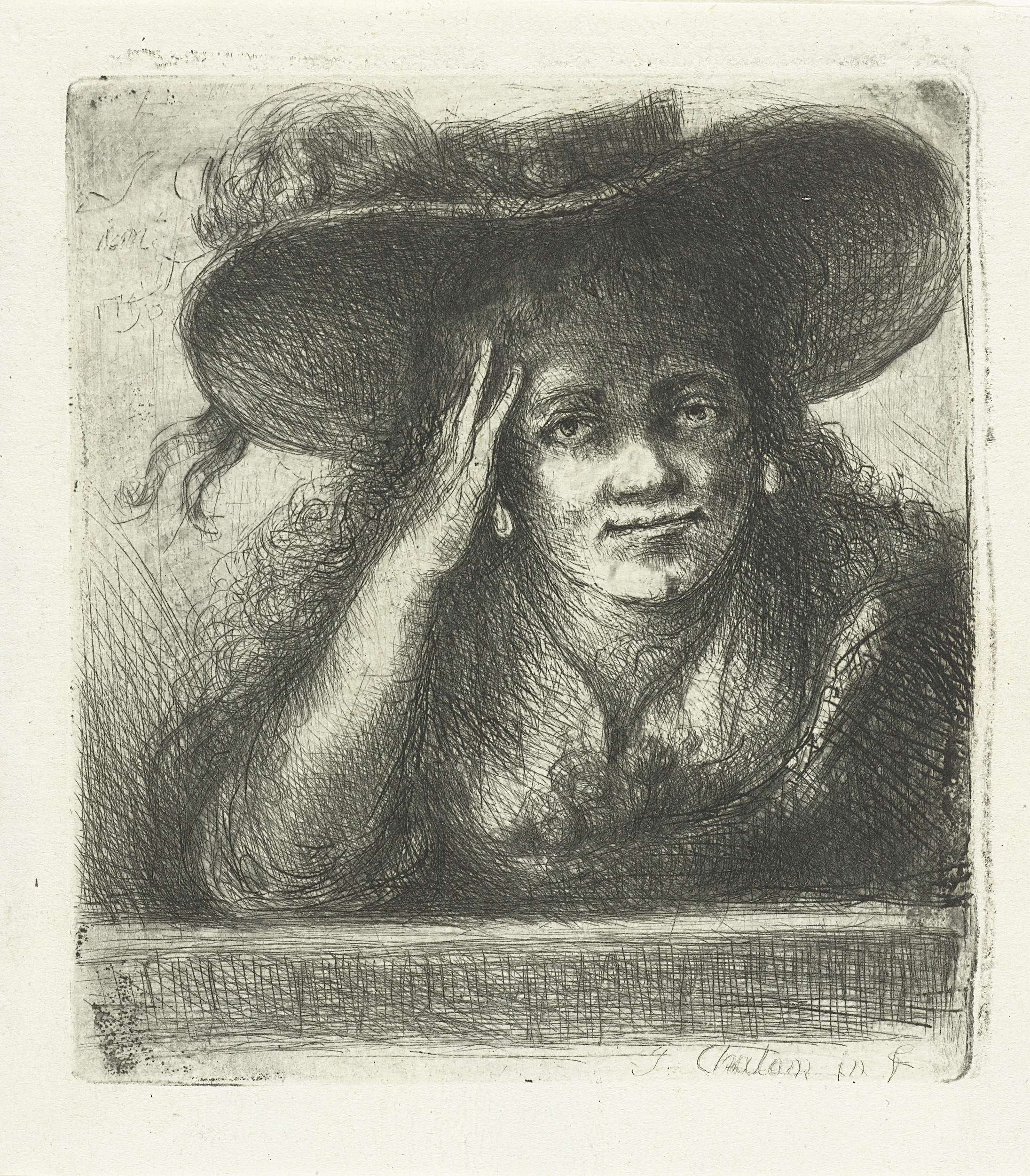 Een vrouw met grote ronde hoed. Ze ondersteunt haar hoofd met haar rechterhand.