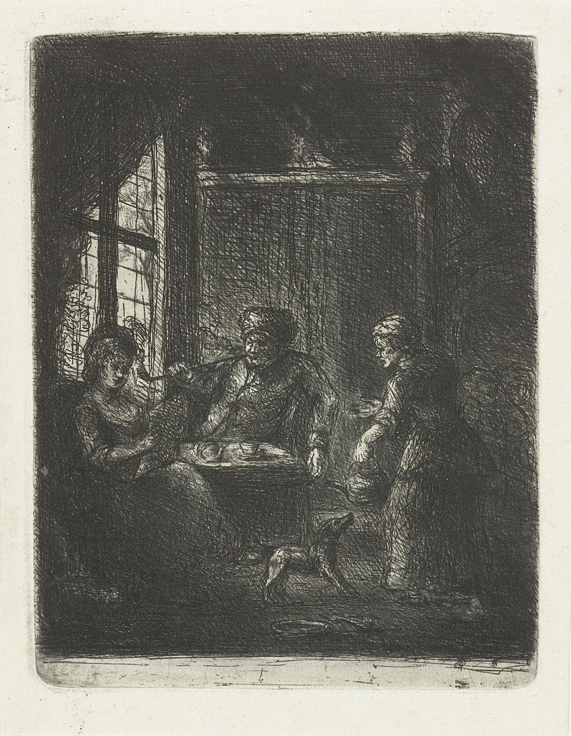 Het interieur van een woonkamer. Een man rookt een pijp en kijkt al zittend uit het raam. Zijn vrouw leest de krant. De meid komt thee of koffie brengen.