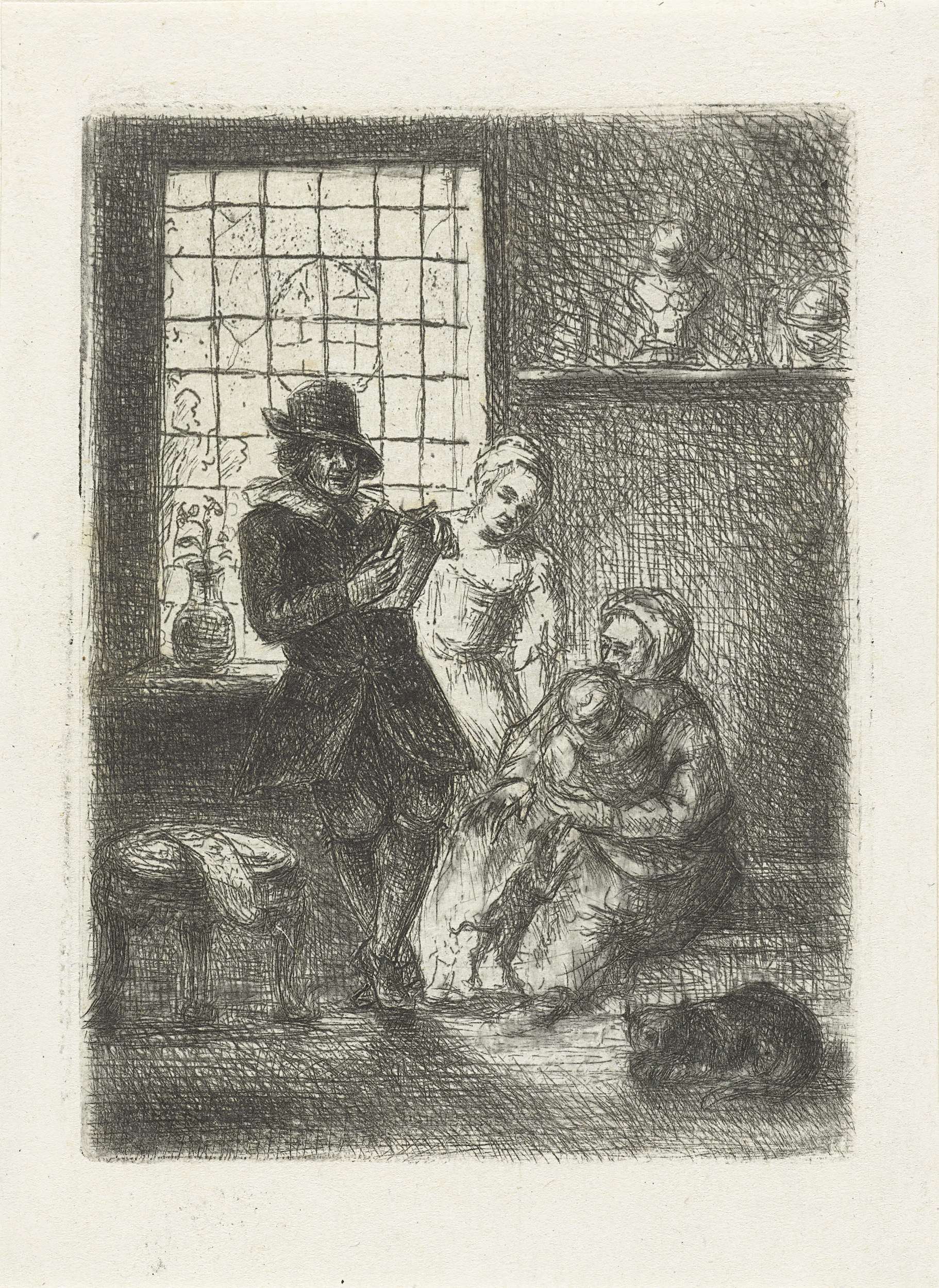 Interieur van een woonkamer. Een man leest al staande een pamflet, terwijl zijn vrouw (?) kijkt hoe de min met hun kind speelt.