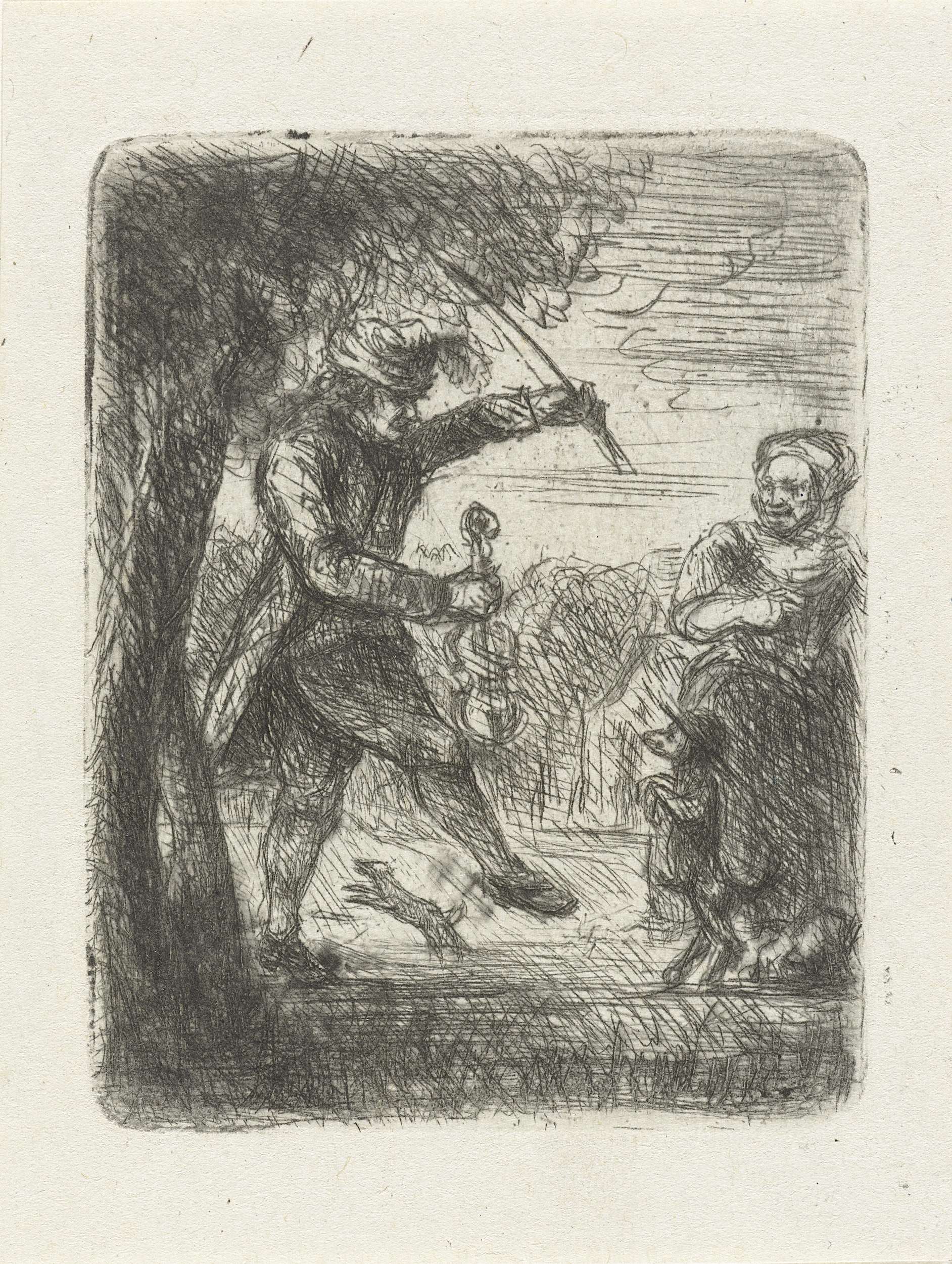 Een straatmuzikant speelt viool voor een jonge dienstmeid. Twee honden dansen rondom hem.