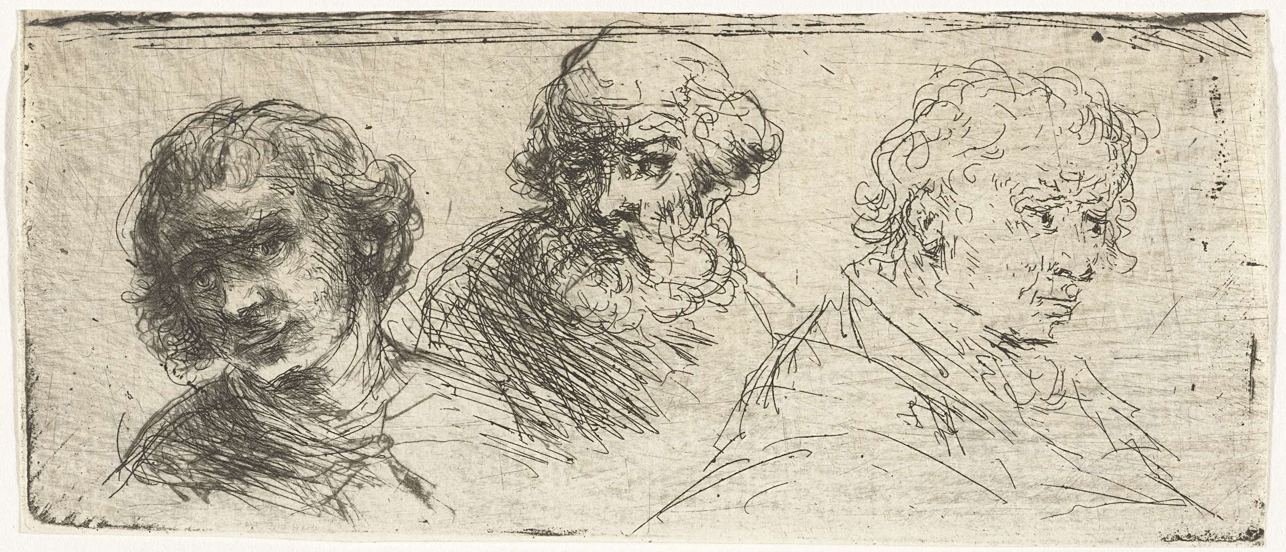 Portretstudie van drie mannen. De linker is jong met buste naar links. De middenste is oud met buste naar links. De rechter is jong met buste naar rechts.