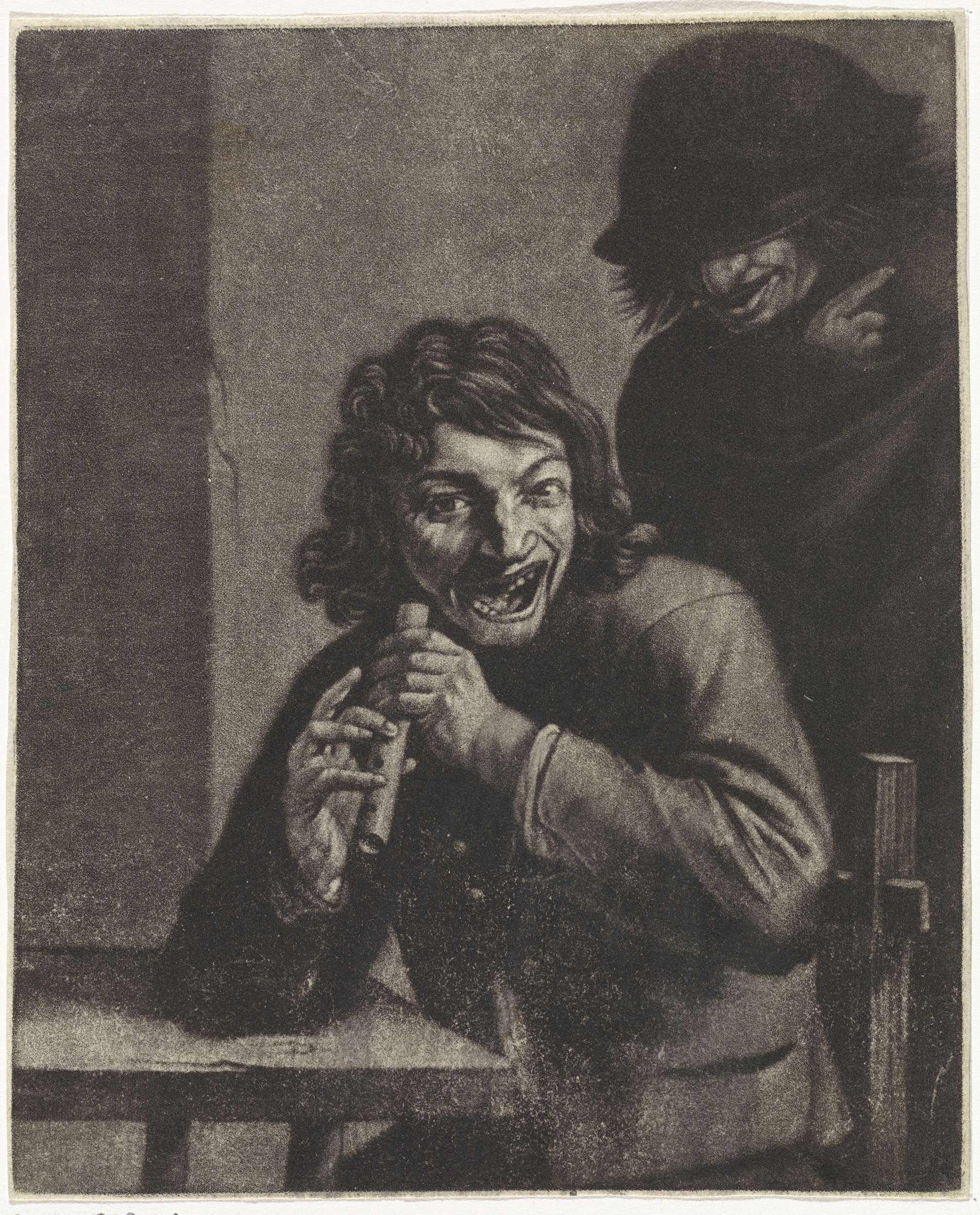 Een jongen met in zijn handen een fluit zit aan een tafel. Achter hem staat een man met een hoed op het hoofd in zijn mantel gewikkeld.