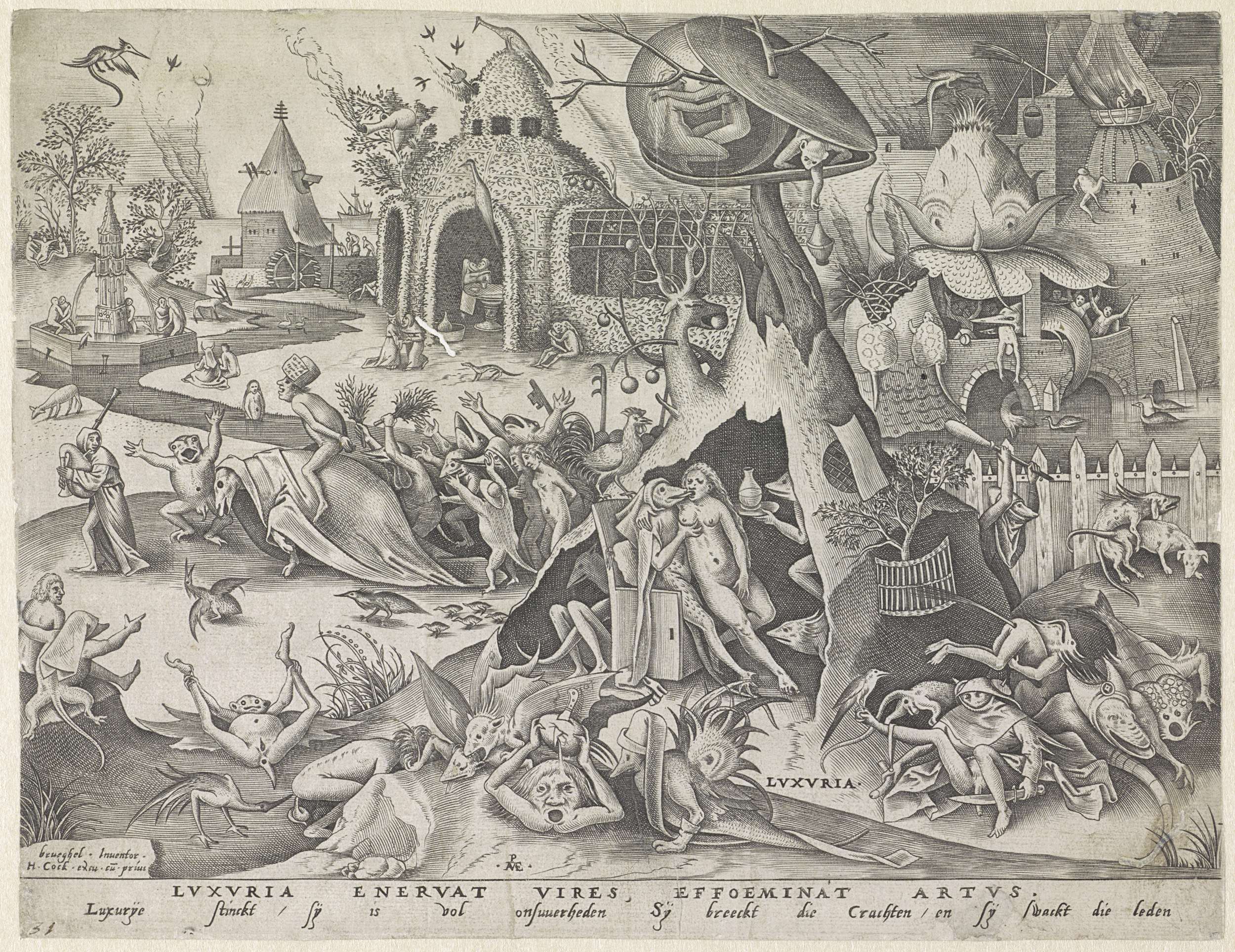 De naakte vrouwelijke personificatie van Wellust of Onkuisheid (Luxuria) vrijt met een monster in een holle boom. Op de rug van de stoel staat een haan. Hieromheen allerlei fantastische scènes en gedrochten waarmee deze hoofdzonde wordt uitgebeeld. Links op de achtergrond een tuin der lusten. Met onderschrift van een regel in het Latijn en een ...