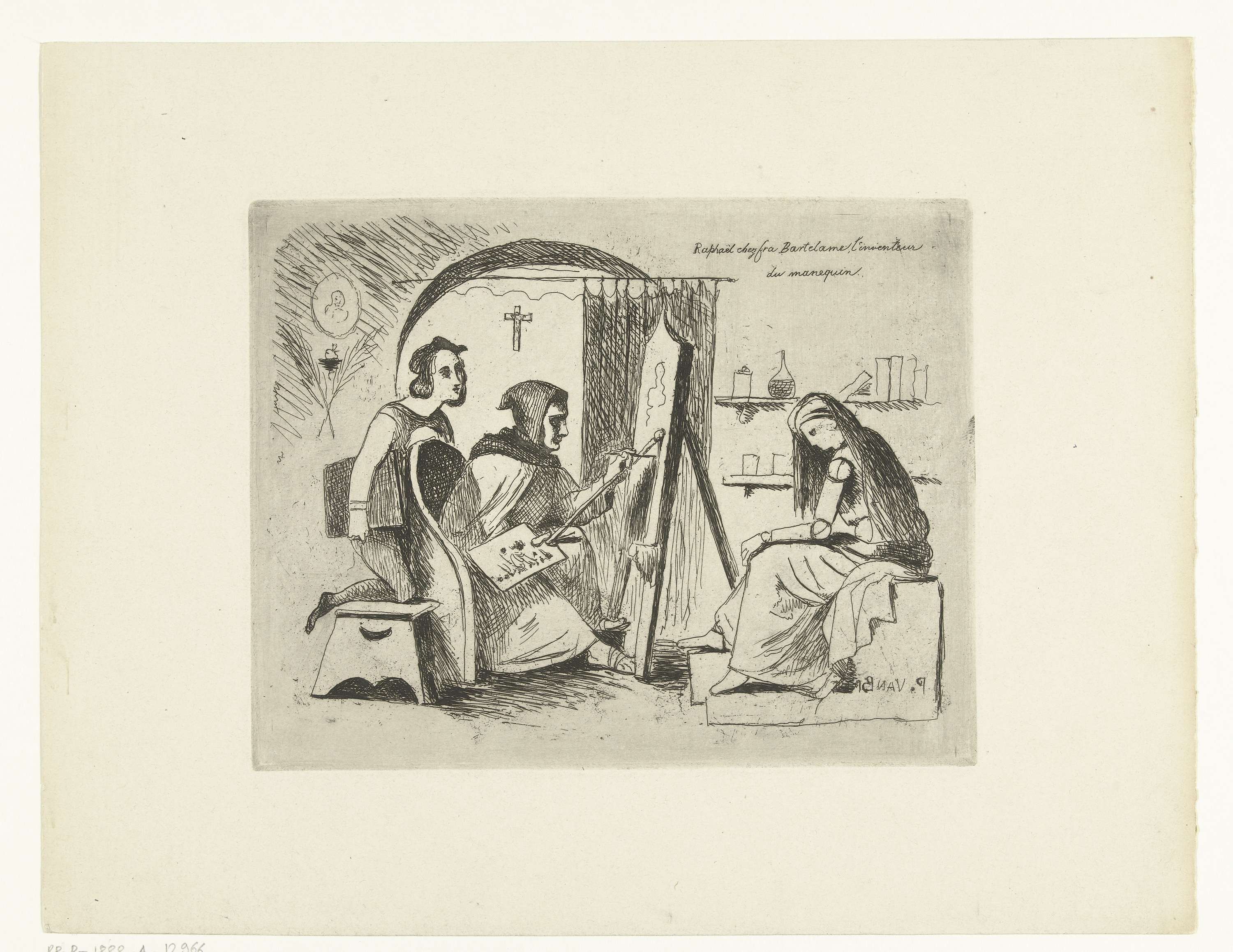 Rafaël en Fra Bartolomeo werken in een studio aan een schilderij. Fra Bartolommeo zit achter een ezel en is aan het schilderen. Rafaël leunt over zijn stoel en kijkt met hem mee. Rechts zit een ledenpop op een bodes. Volgens het opschrift hebben Rafaël en Fra Bartolommeo deze pop zelf ontwikkeld.
