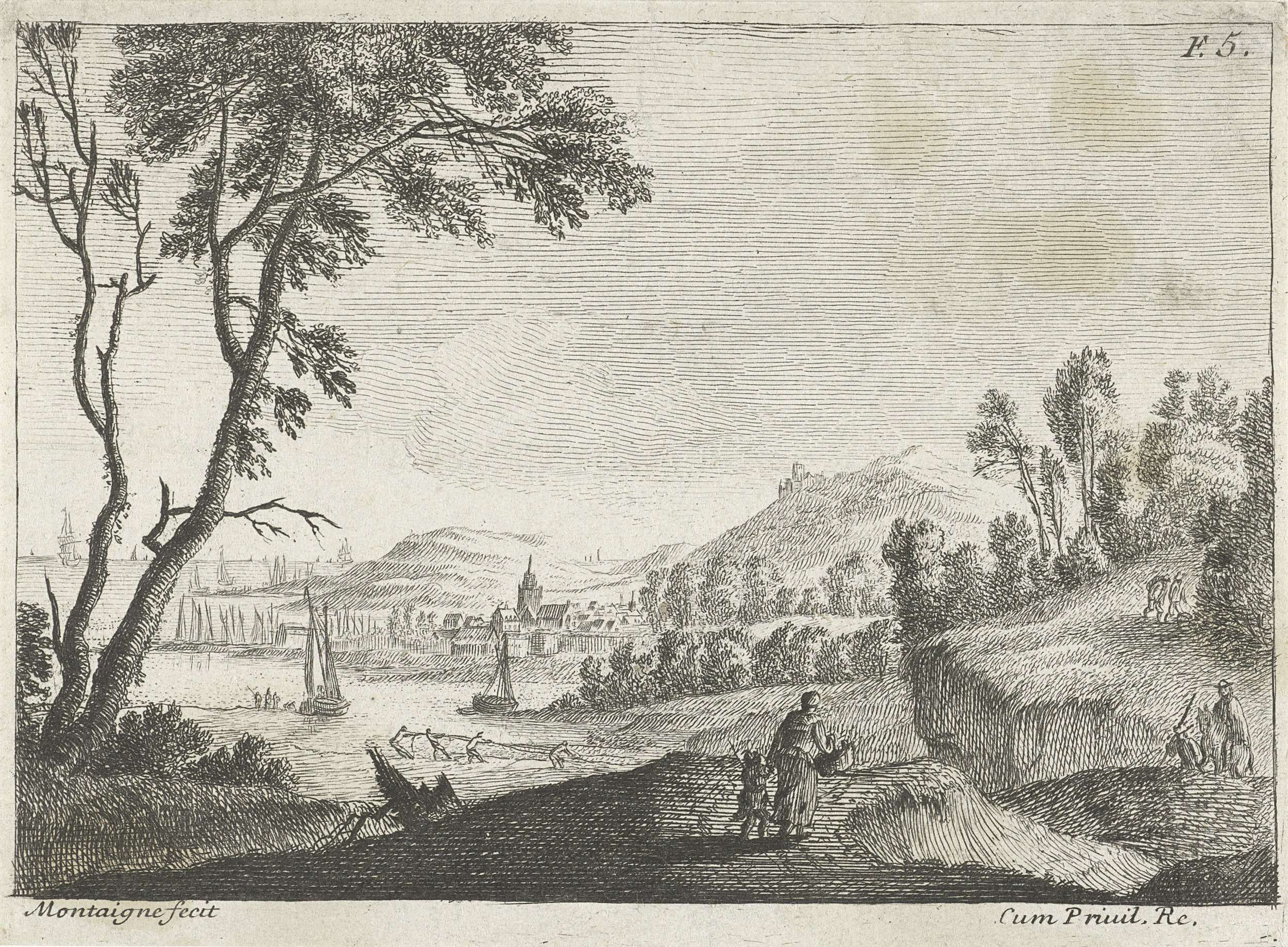 Een moeder loopt met haar kind aan de hand over een pad door een heuvelachtig landschap. Links op de achtergrond gezicht op een stad met een kleine haven. Rechtsboven gemerkt: F.5.