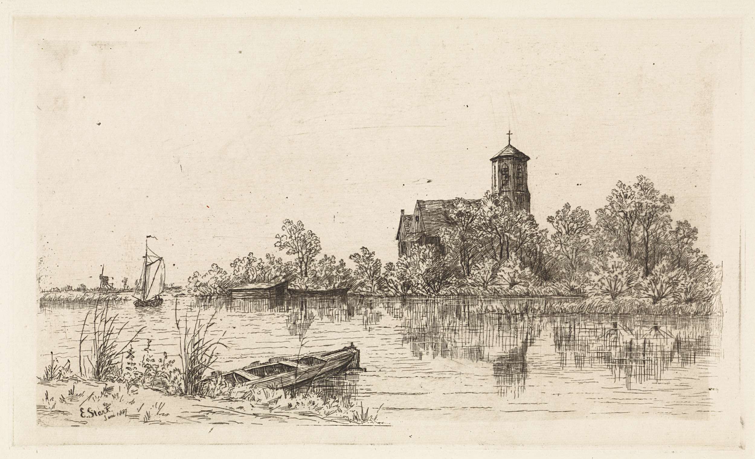 Gezicht op de St. Urbanuskerk te Bovenkerk met op de voorgrond water en een roeiboot.