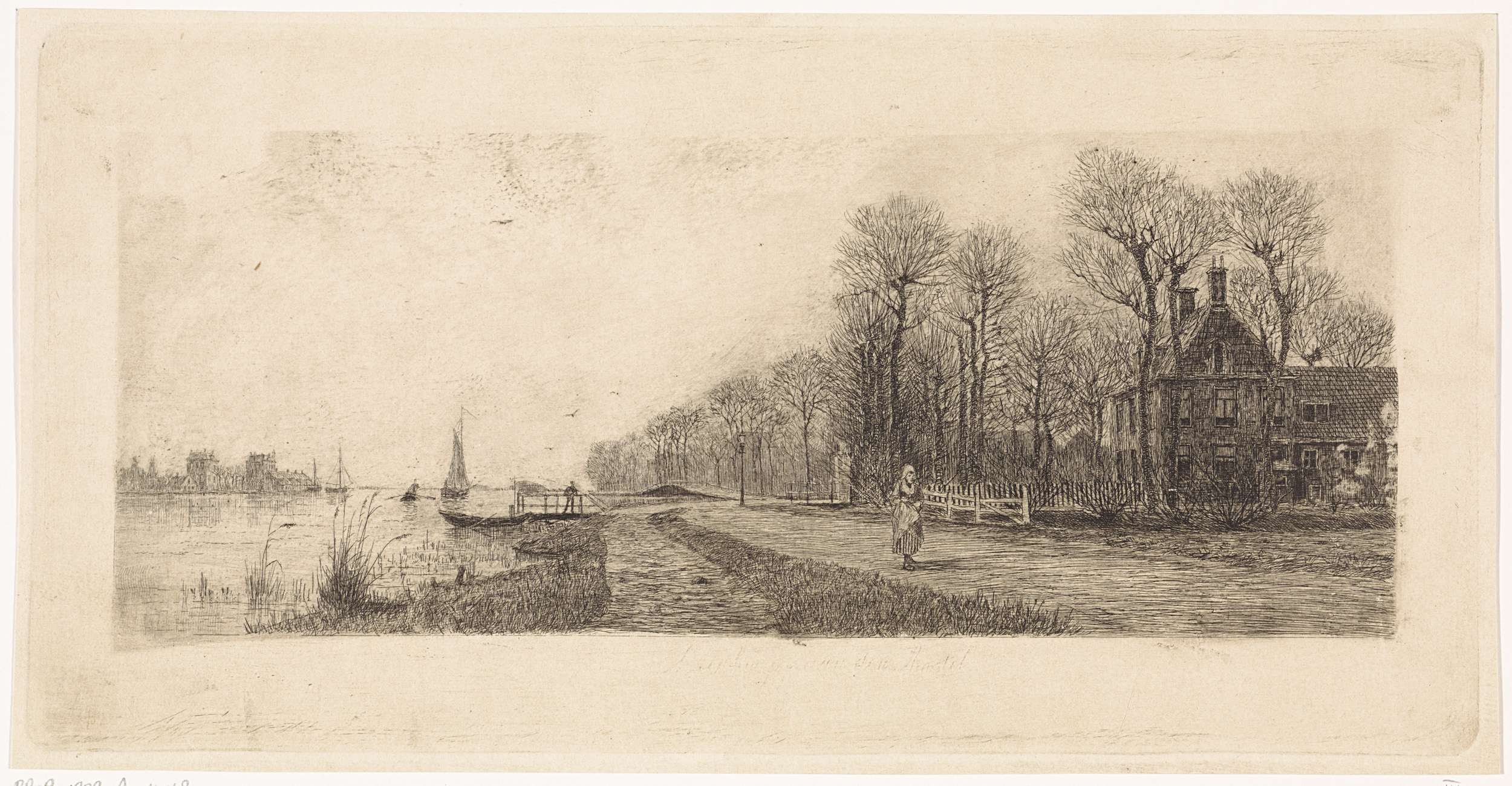 Huizen langs de rivier de Amstel. Op de weg loopt een vrouw.