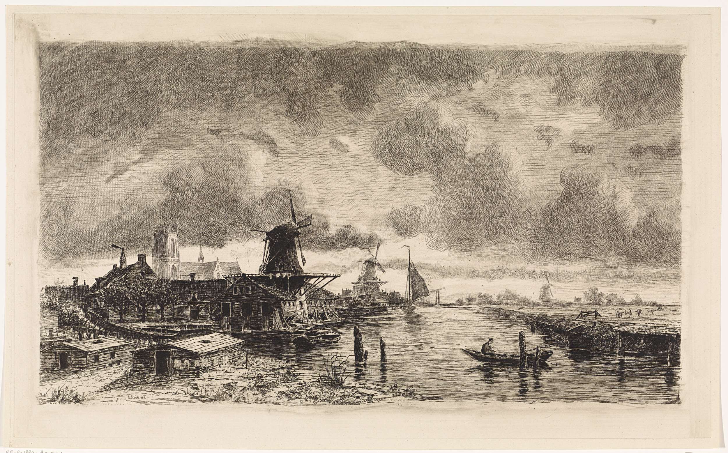 Zicht op een rivier met links een dorp met kerk en een houtzaagmolen. Op het water een visser in een schuit en op de achtergrond een zeilschip.