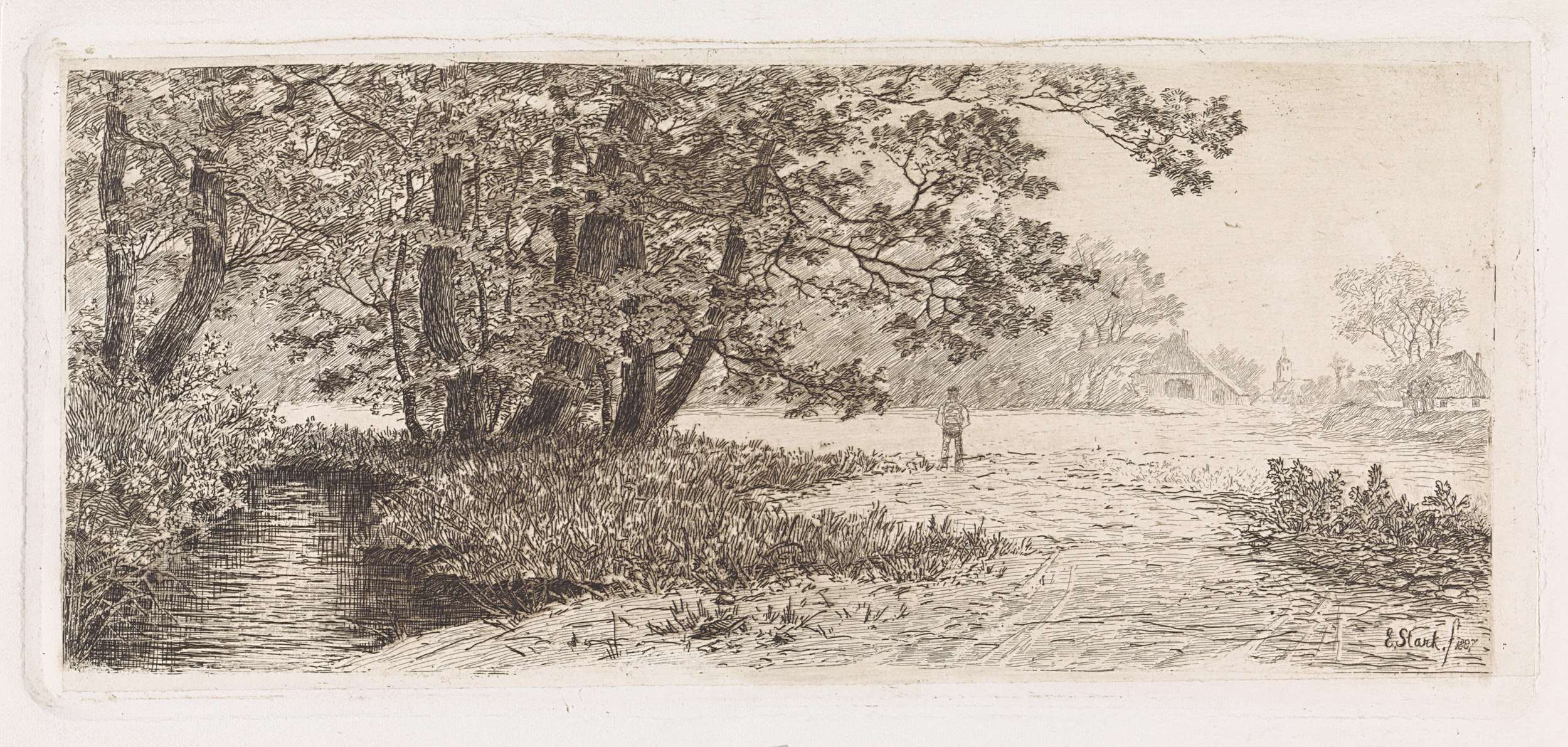 Landschap met links bomen langs een sloot. Rechts op de achtergrond een man op de rug gezien en een dorp.