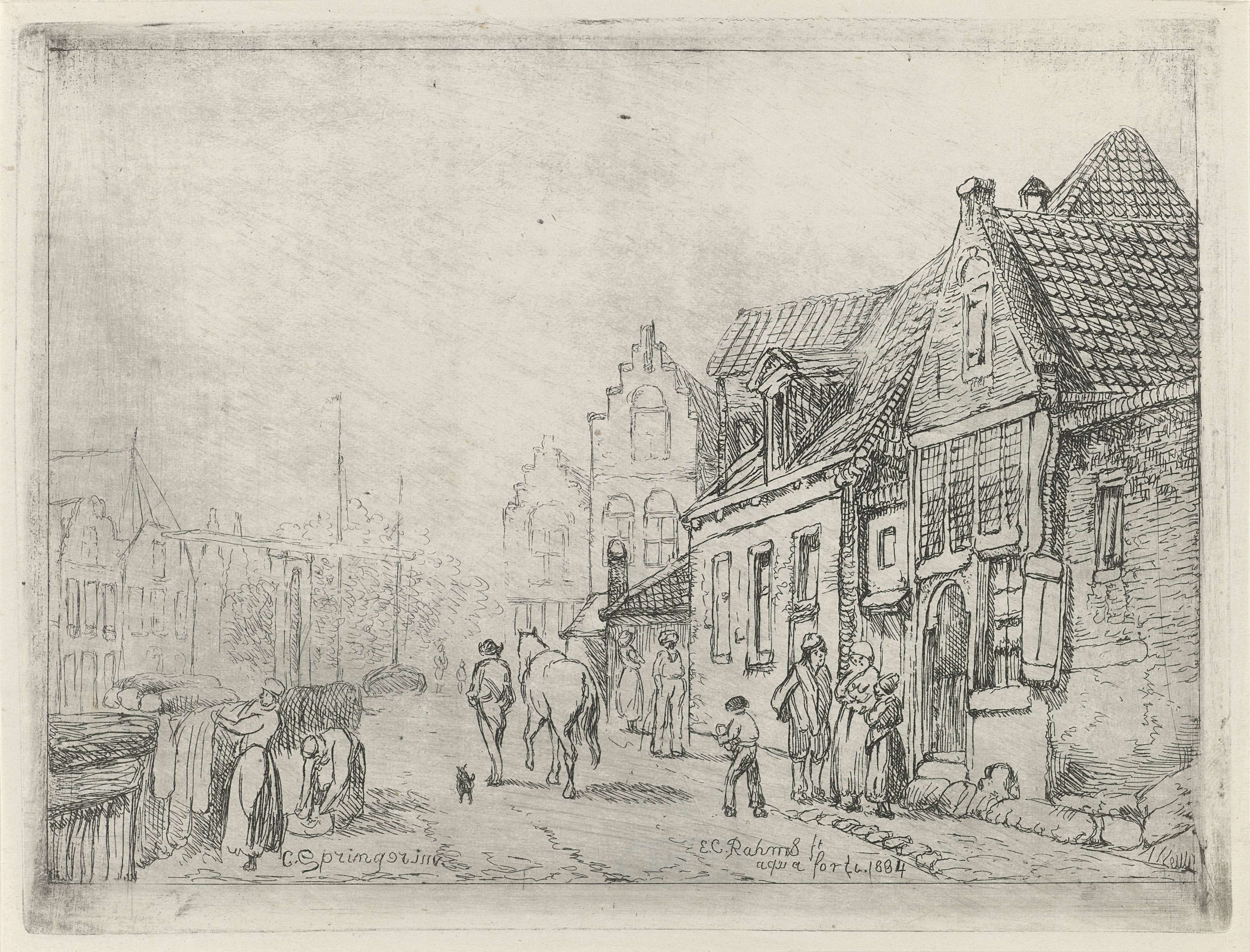 Gezicht op een straat in een stad met links vrouwen die de was te drogen hangen. Op straat enkele figuren en een man met een paard. Op de achtergrond een ophaalbrug en masten van boten.