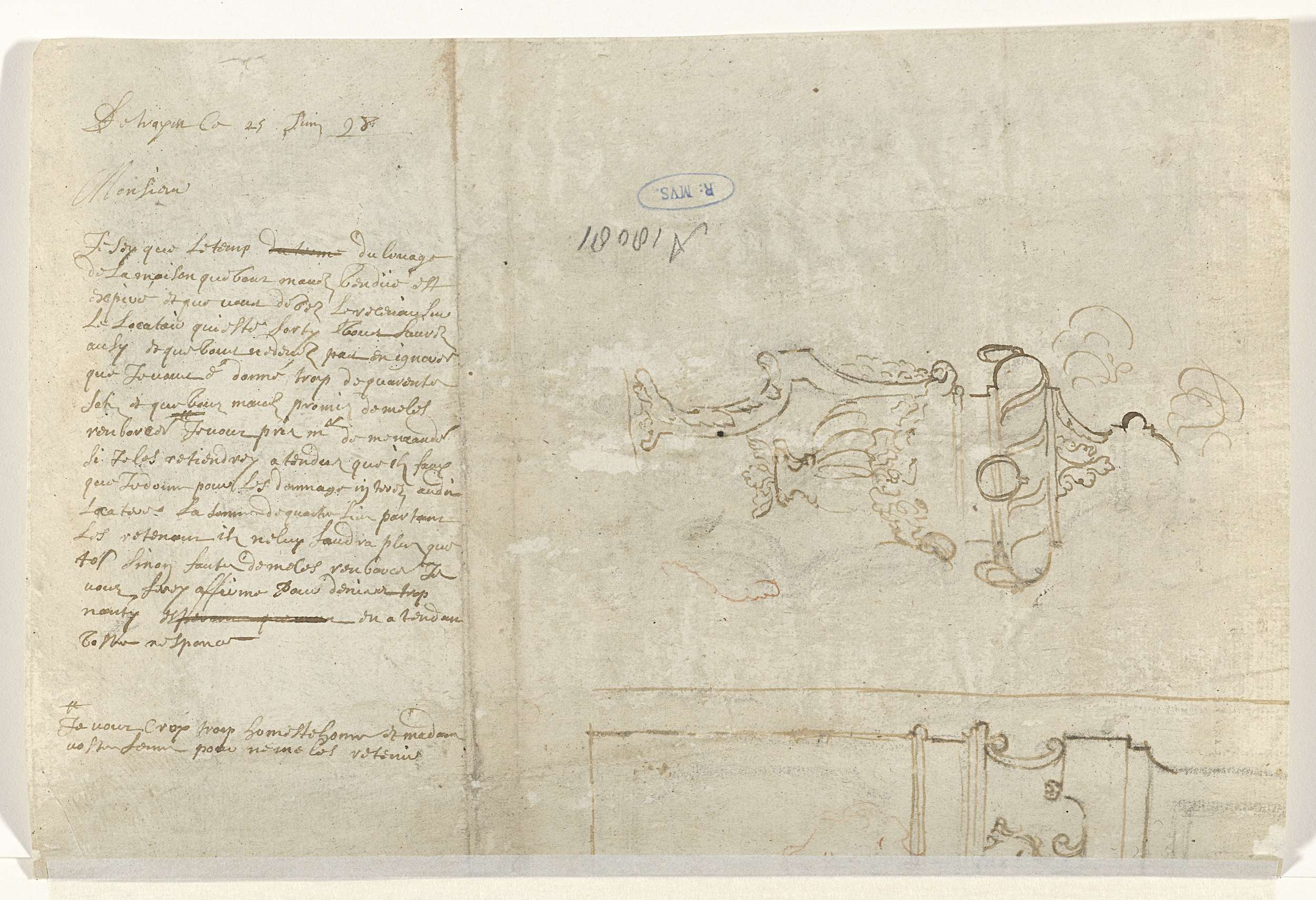 Handgeschreven brief in het Frans met plaats en datum Antwerpen(?) le 25 Juni 28 en beginnend met Monsieur. Daarnaast twee schetsen van twee onderling verschillende zuilen.
