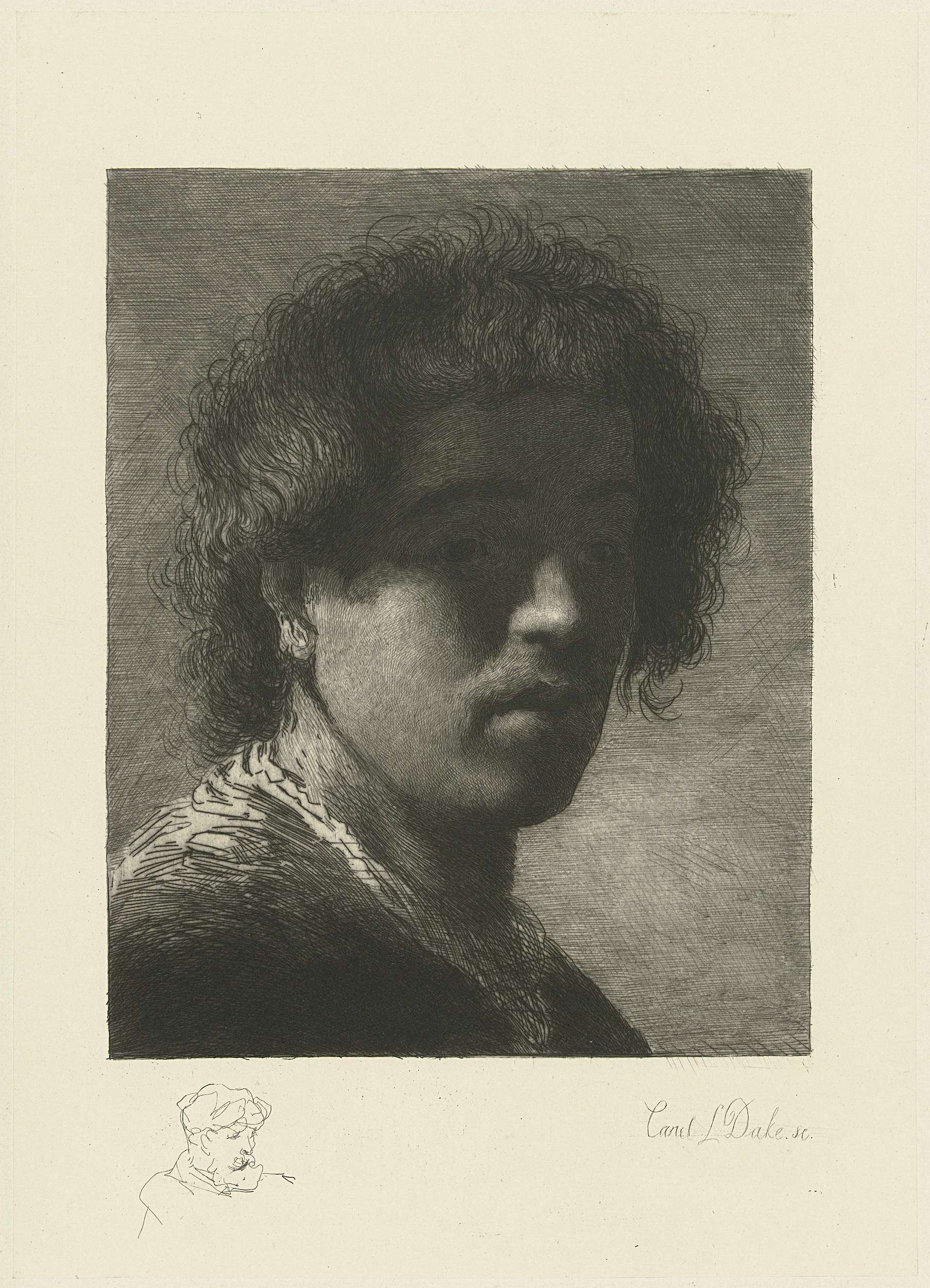 Portret van Rembrandt Harmensz. van Rijn naar het bekende zelfportret van de schilder. In de marge een remarque met het zelfportret van Carel Lodewijk Dake.