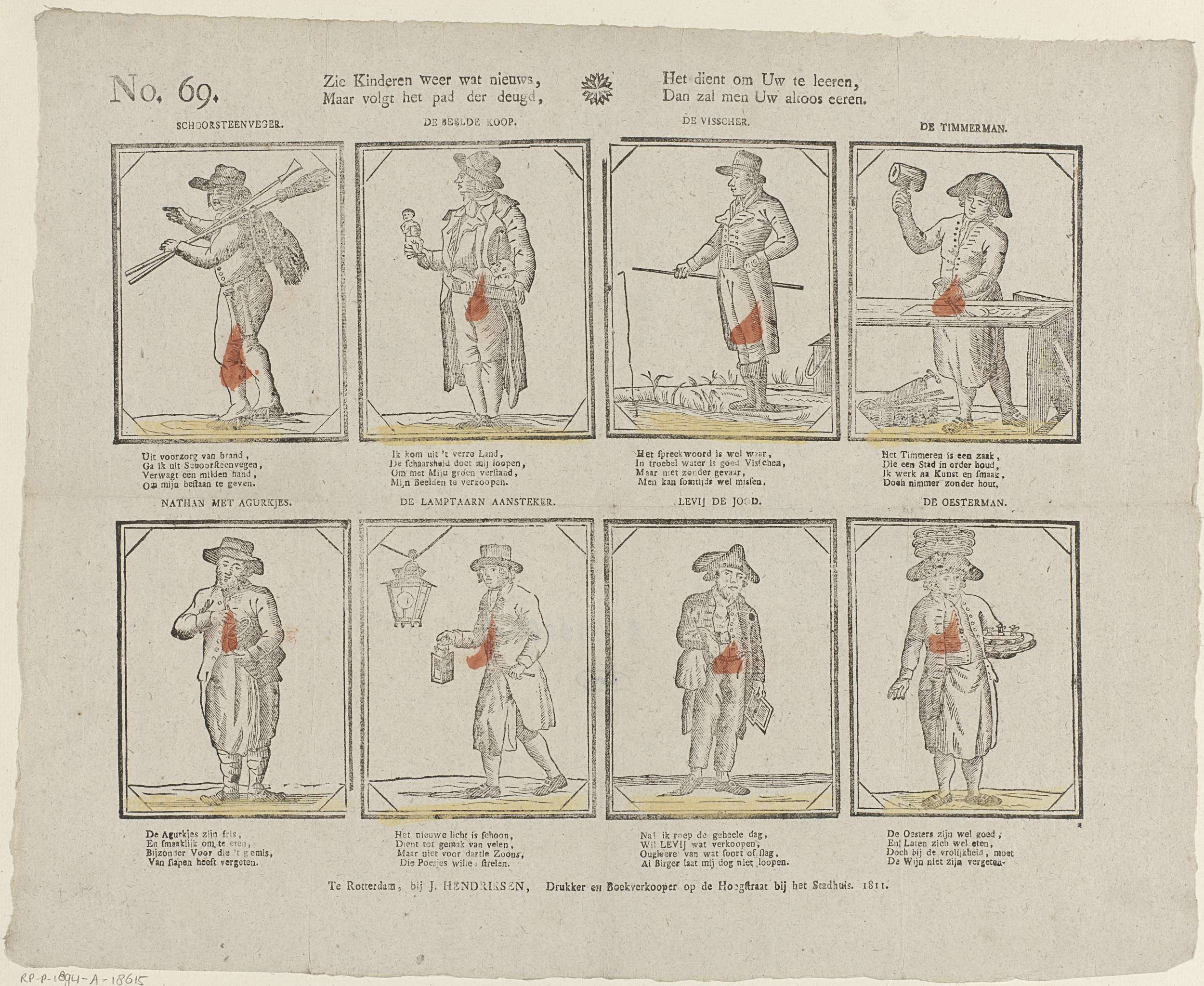 Blad met 4 voorstellingen van ambachtslieden en beroepen, zoals schoorsteenveger, visser en lantaarnaansteker. Onder elke afbeelding een vierregelig vers. Genummerd linksboven: No. 69.