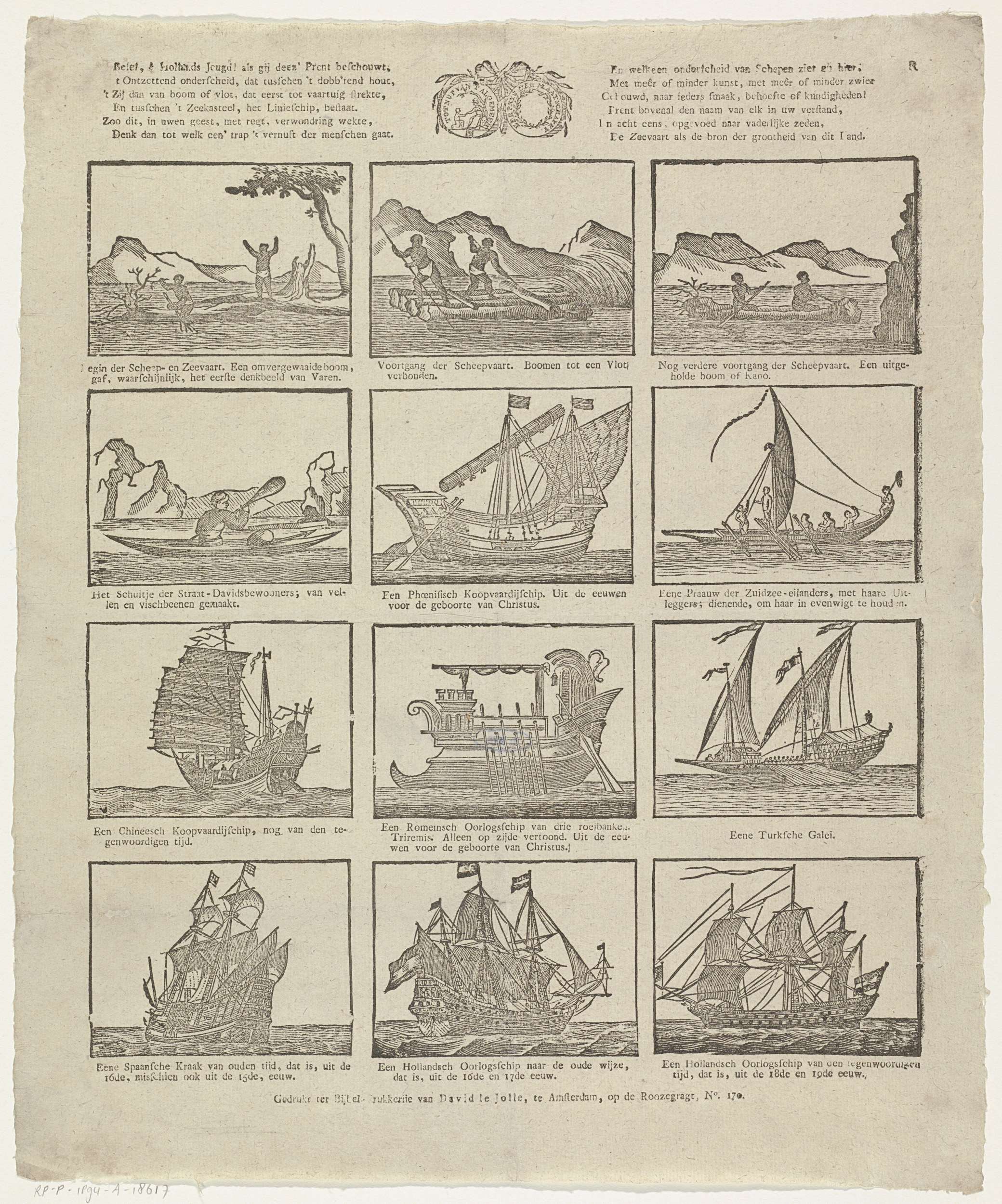 Blad met 12 voorstellingen van vaartuigen, zoals een simpele boomstamkano en een Hollands oorlogsschip. Bovenaan twee zesregelige verzen. Midden boven het zegel van de Maatschappij tot Nut van 't Algemeen. Onder elke afbeelding een tweeregelig onderschrift. Genummerd rechtsboven: R.
