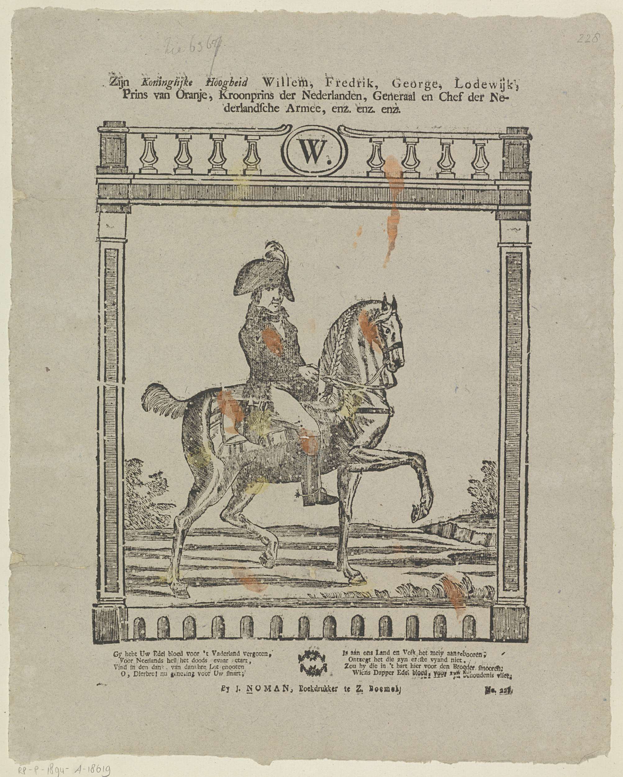 Portret van Napoleon I Bonaparte te paard, hier als Willem II bedoeld. De voorstelling is gevat in een sierlijst, met aan de bovenzijde een balustrade. Onder de afbeelding een vers in twee kolommen. Genummerd rechtsonder: No. 228.