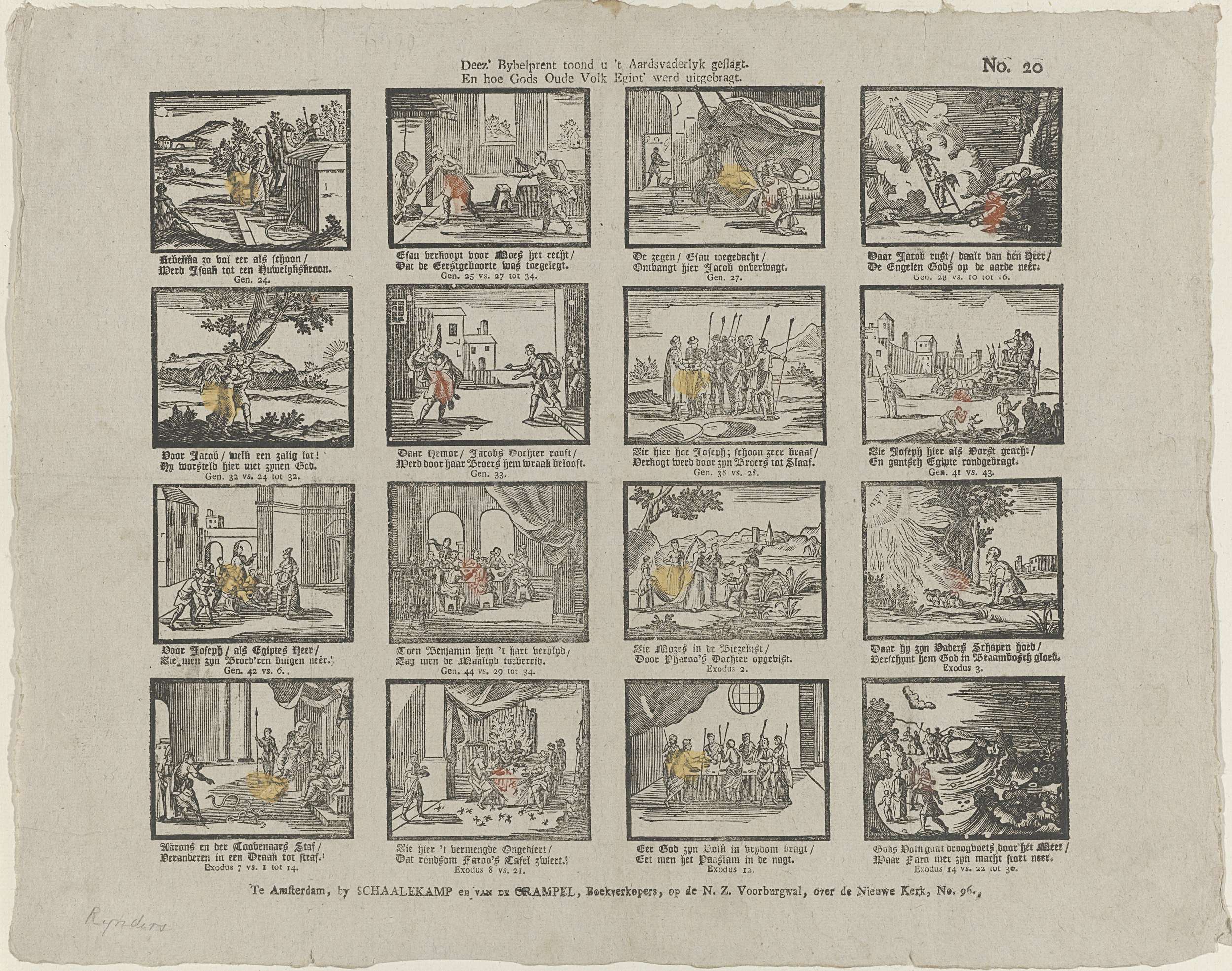 Blad met 16 voorstellingen van verhalen uit het Oude Testament, waaronder Jakobs droom, Mozes die wordt gevonden en de doortocht door de Rode zee. Onder elke voorstelling een tweeregelig vers en een verwijzing naar de bijbehorende Bijbeltekst. Genummerd rechtsboven: No. 20.