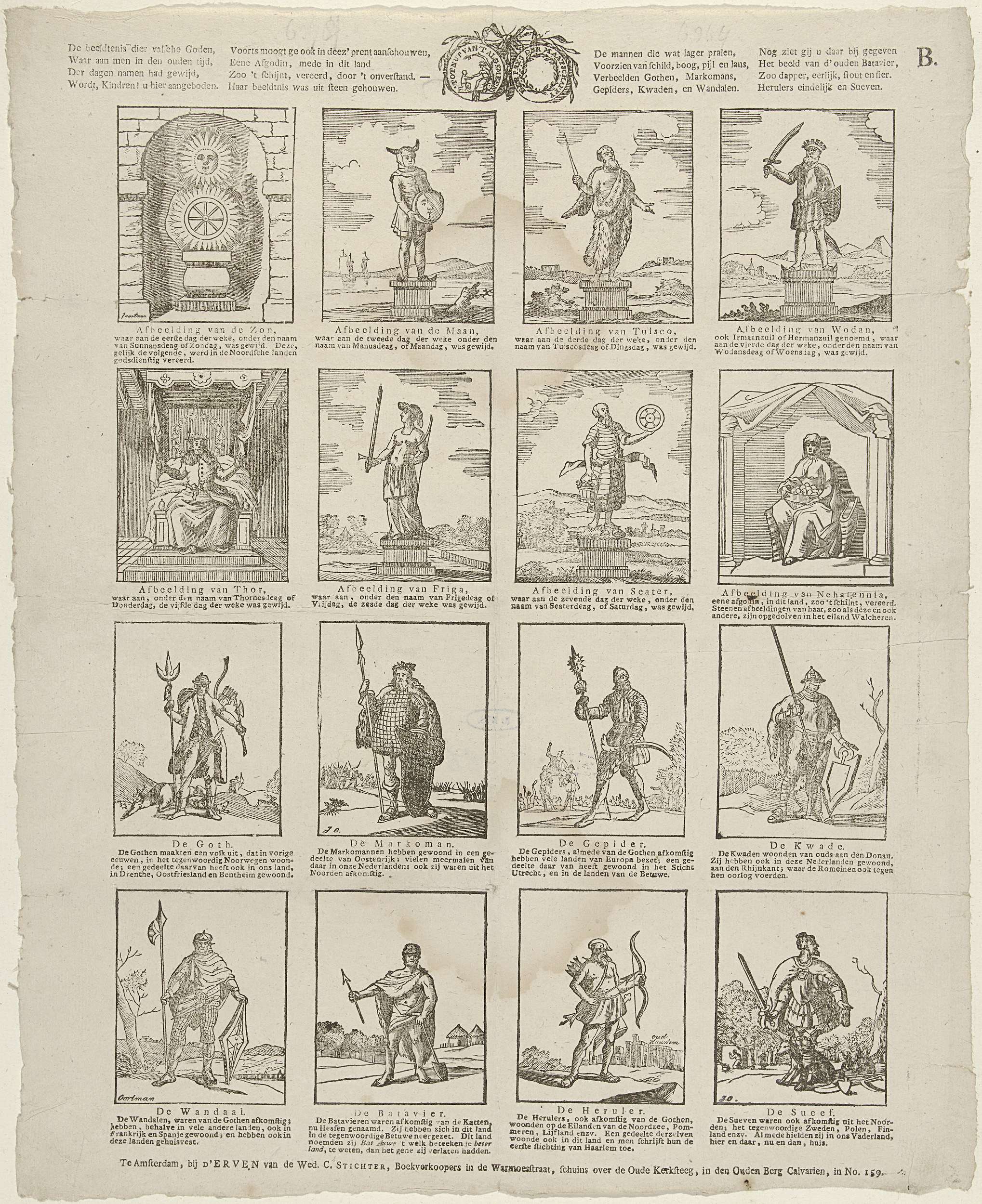 Blad met 16 voorstellingen van mythologische en historische figuren. Met bovenaan de zegel van de Maatschappij tot Nut van 't Algemeen. Onder elke afbeelding een onderschrift. Gemerkt rechtsboven: B.