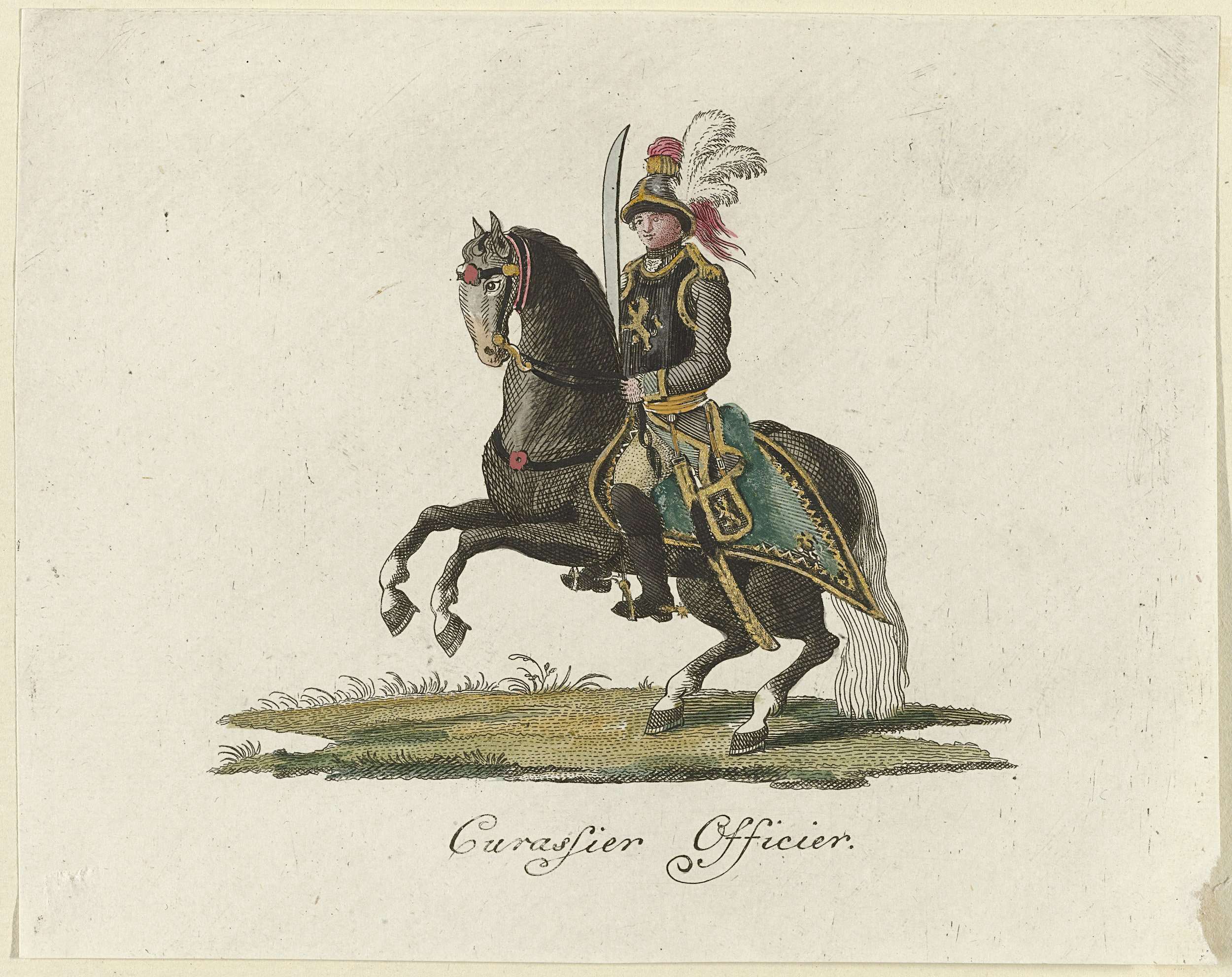 Kurassier in uniform te paard. Onderdeel van de prentserie van uniformen van het legioen van Frederik III Rijngraaf van Salm, in dienst van Republiek in 1785.