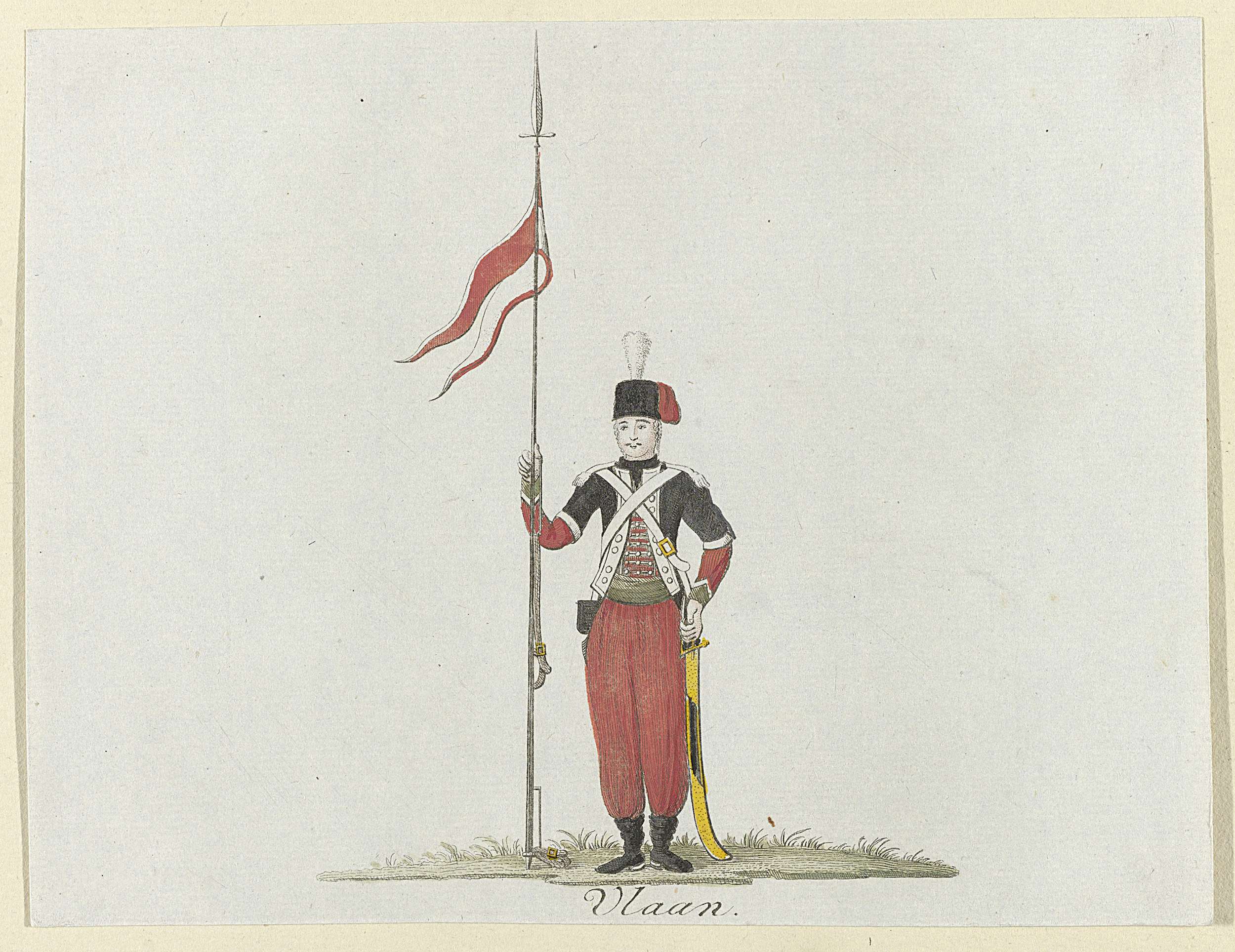 Staande Ulaan in uniform met vaandel. Onderdeel van de prentserie van uniformen van het legioen van Frederik III Rijngraaf van Salm, in dienst van Republiek in 1785.