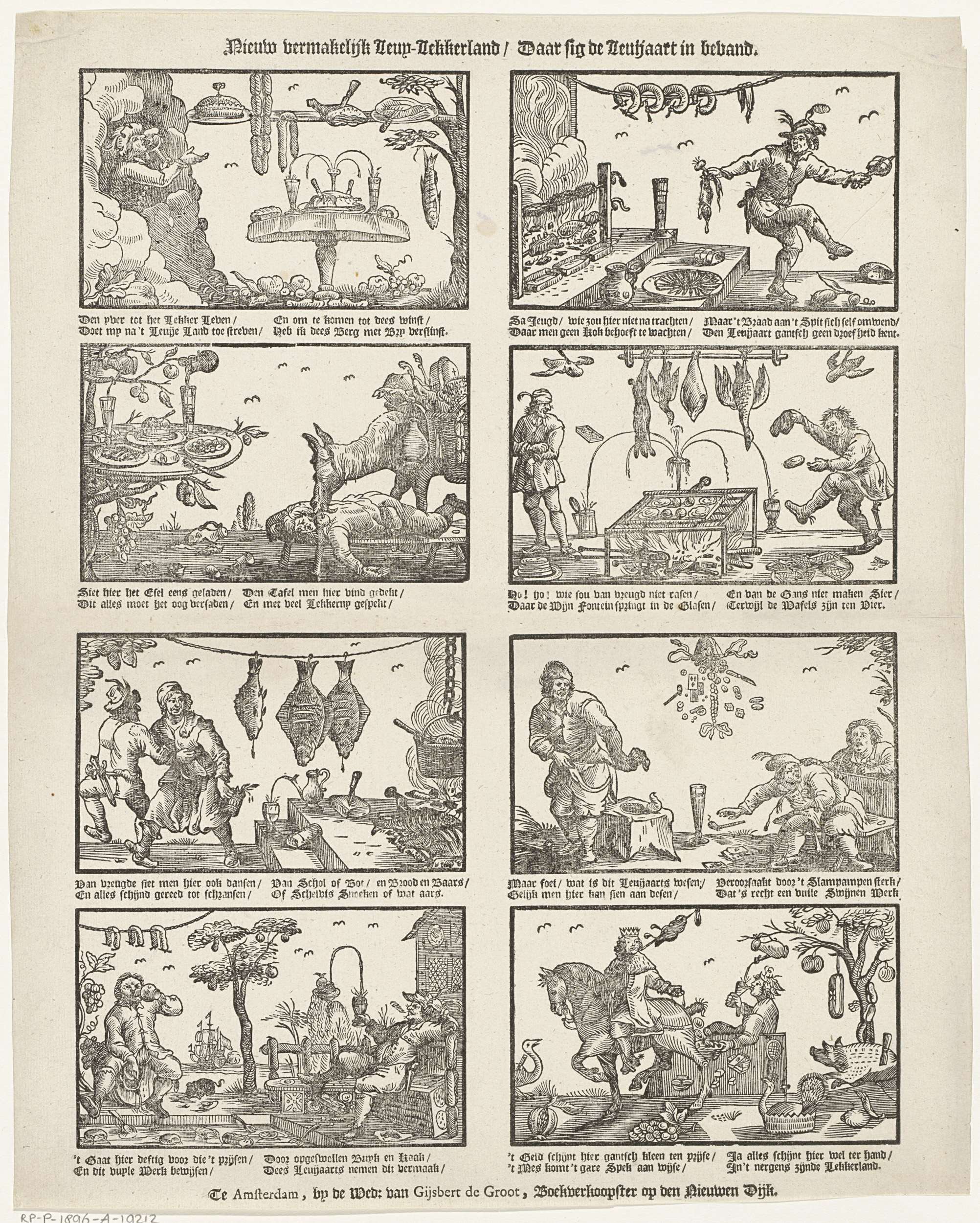 Blad met 8 voorstellingen van het Luilekkerland. Onder elke afbeelding een tweeregelig vers.